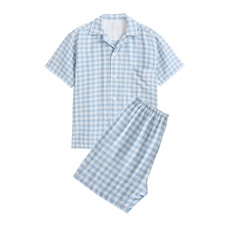 [Двухслойные марлевые короткие рукава + шорты] Светло-голубая мелкая сетка - мужской стиль