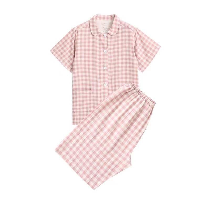 [Двухслойные марлевые короткие рукава + шорты] Розовая маленькая сетка-женский стиль