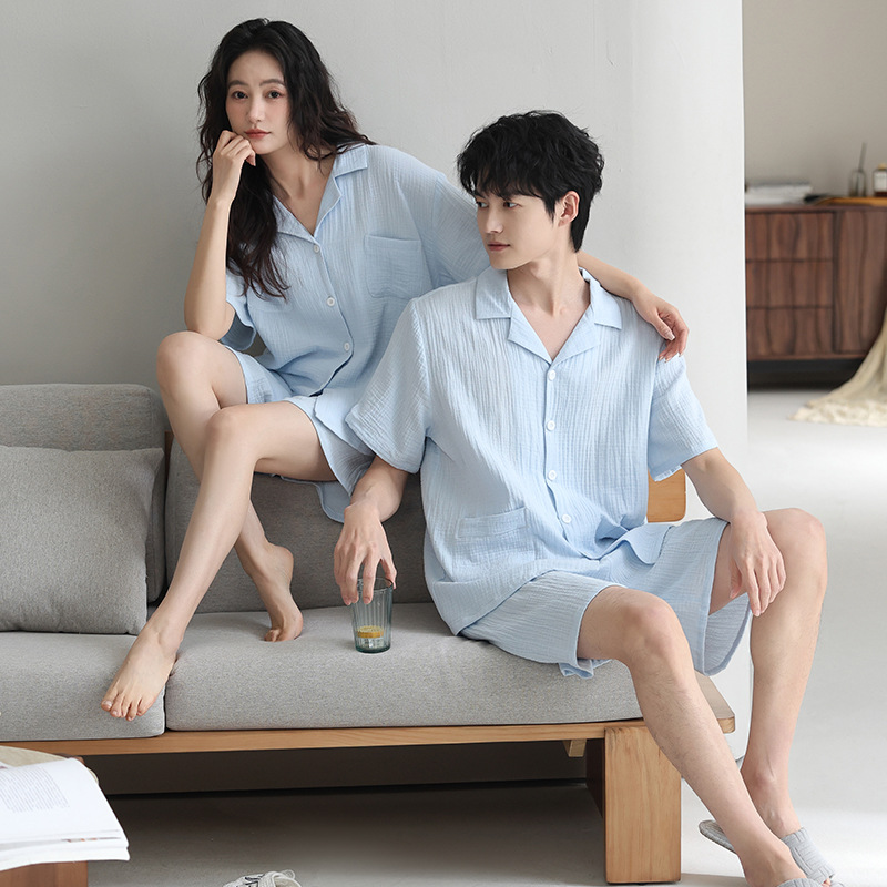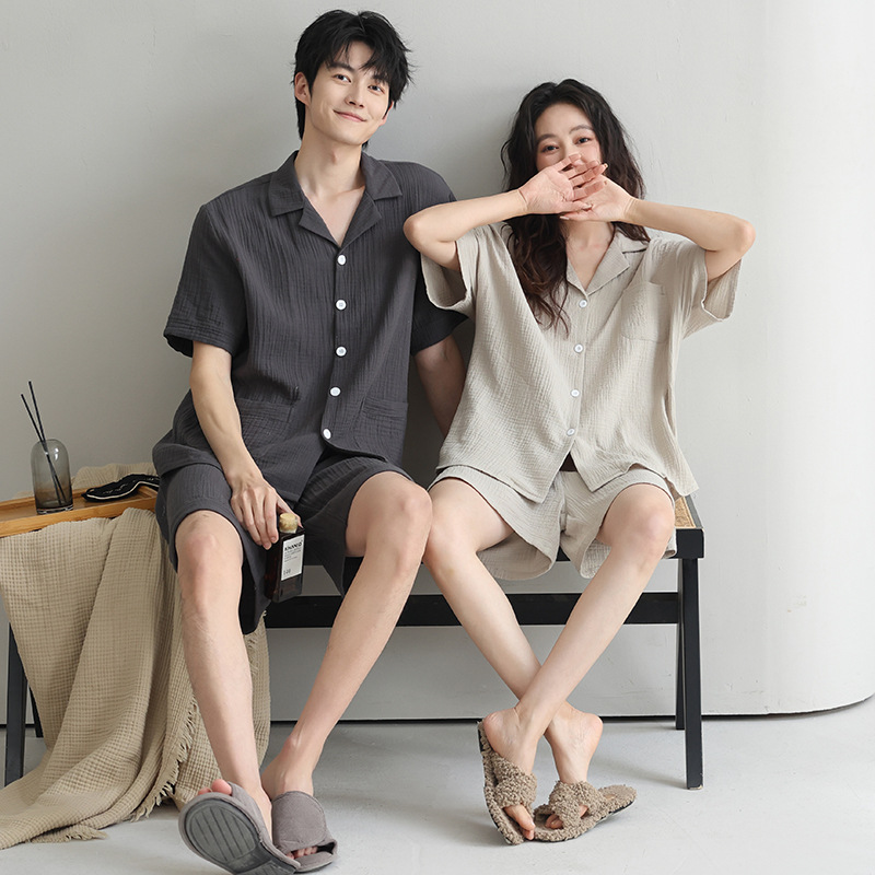 Главная страница > Летние хлопковые тканые двухслойные марлевые пары пижамы простые корейские шорты с короткими рукавами мужская и женская домашняя одежда