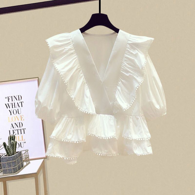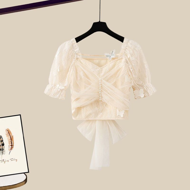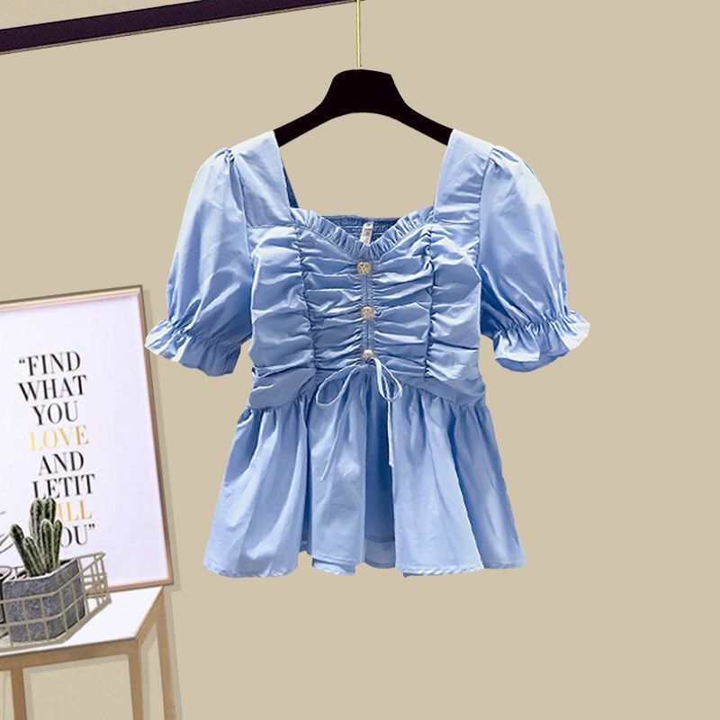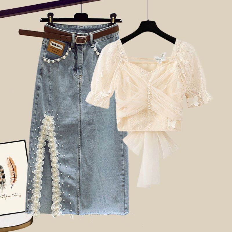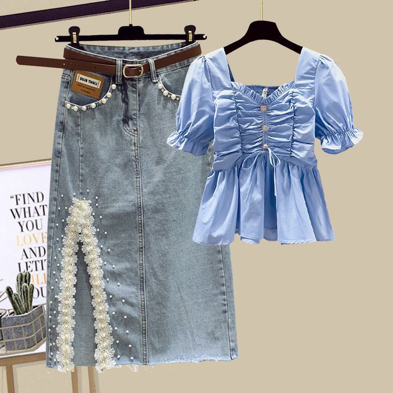 Летний женский костюм дизайн чувство ниши шифоновая юбка с короткими рукавами джинсовая юбка из двух частей