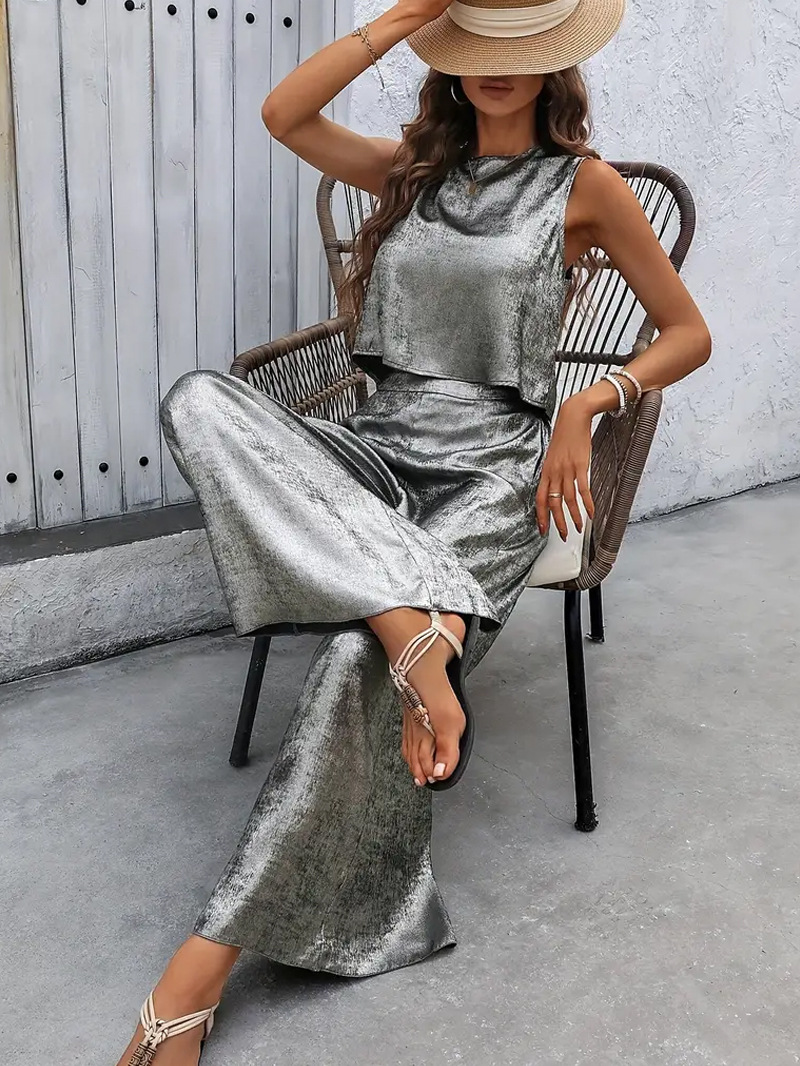 Европейская и американская трансграничная женская одежда амазонка женская мода повседневная сплошной топы без рукавов с короткими рукавами брюки модный набор