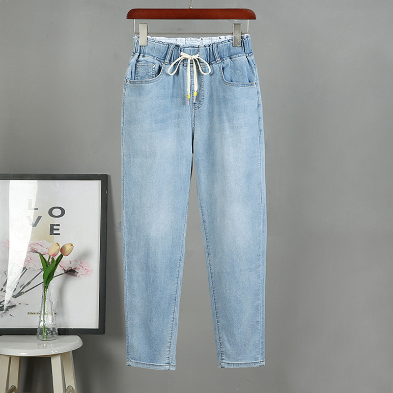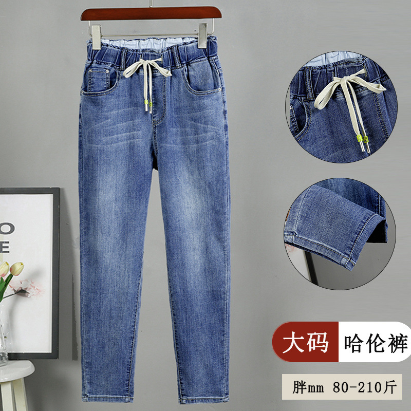Главная страница > Новые эластичные весенне-осенние джинсы больших размеров для женщин, брюки с эластичной резинкой на талии, свободный крой для похудения, широкие бедра, толстые шаровары.
