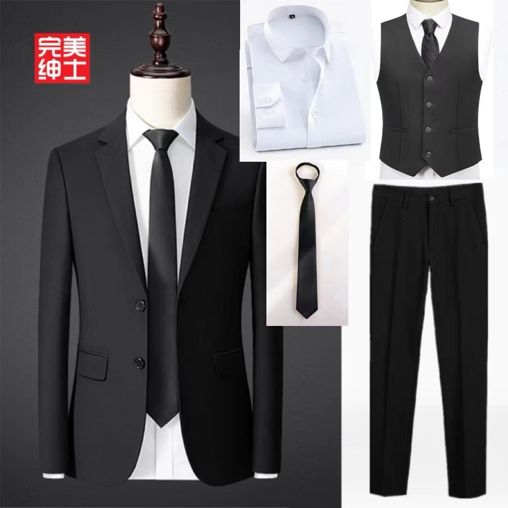 (Комплект из 4 шт.) Черный костюм + черный жилет + белая рубашка + черные брюки.