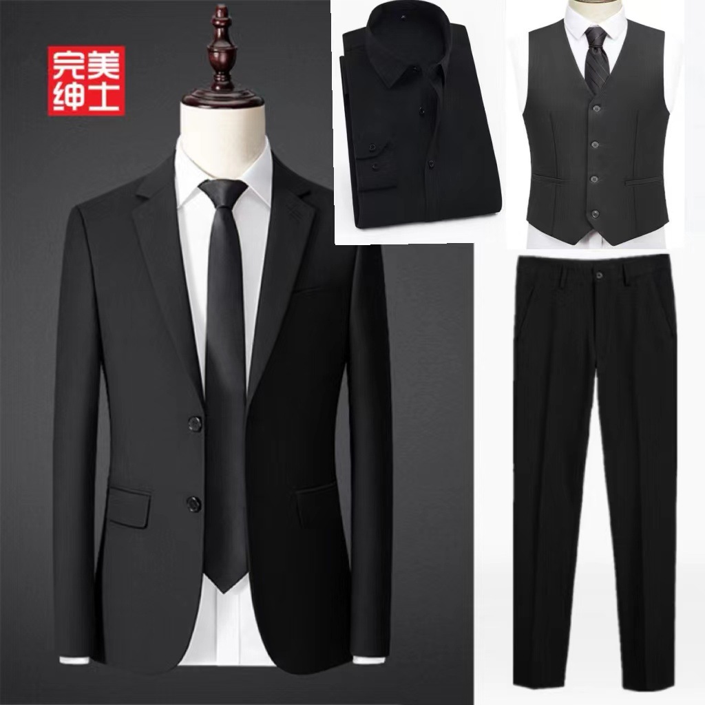 (Комплект из 4 шт.) Черный костюм + черный жилет + черная рубашка + черные брюки.