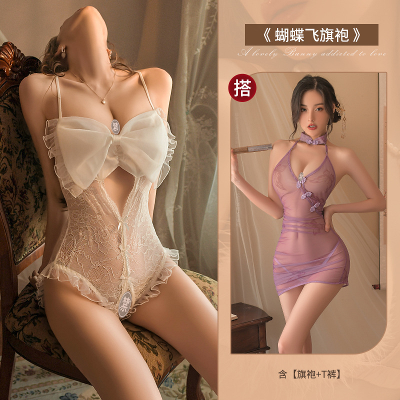 [Классические две части] Белый открытый комбинезон (бесплатные кружевные носки) + летающий Cheongsam с бабочкой