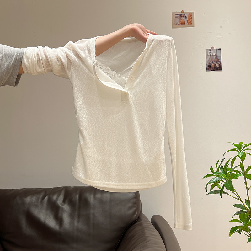 Главная страница > Поддельные два куска нишевые солнцезащитные блузки с V-образным вырезом кружева с длинными рукавами женская 2025 летняя повседневная тонкая тонкая прозрачная рубашка