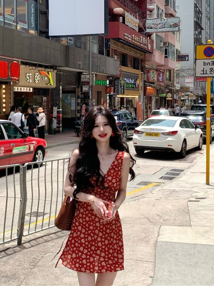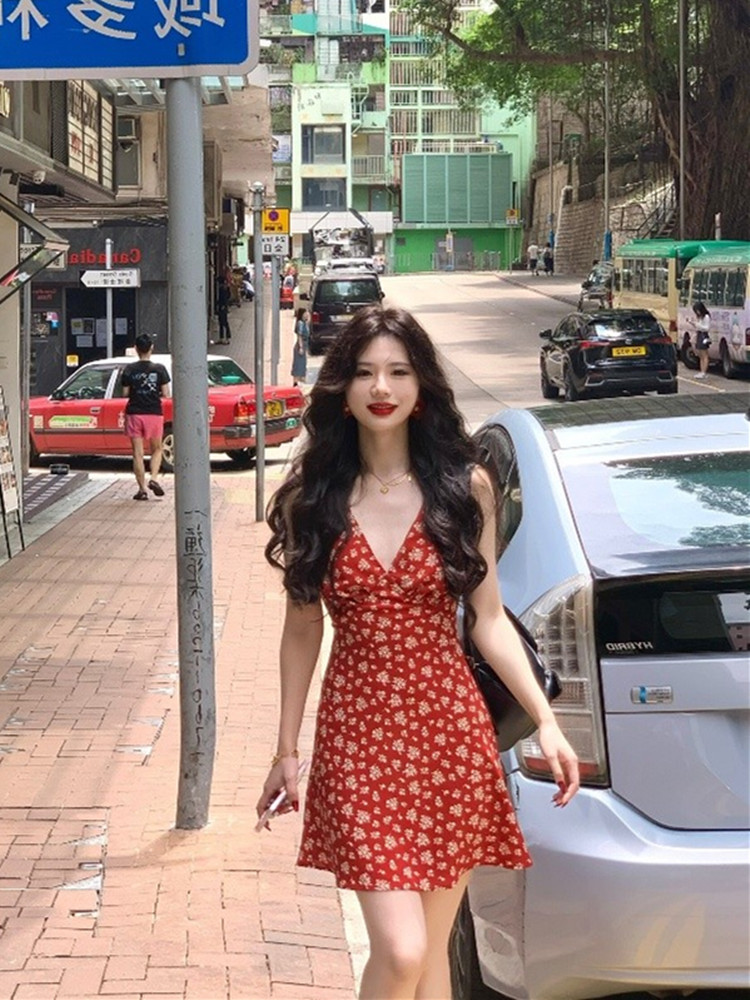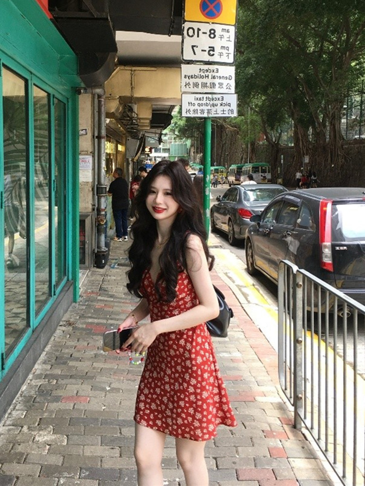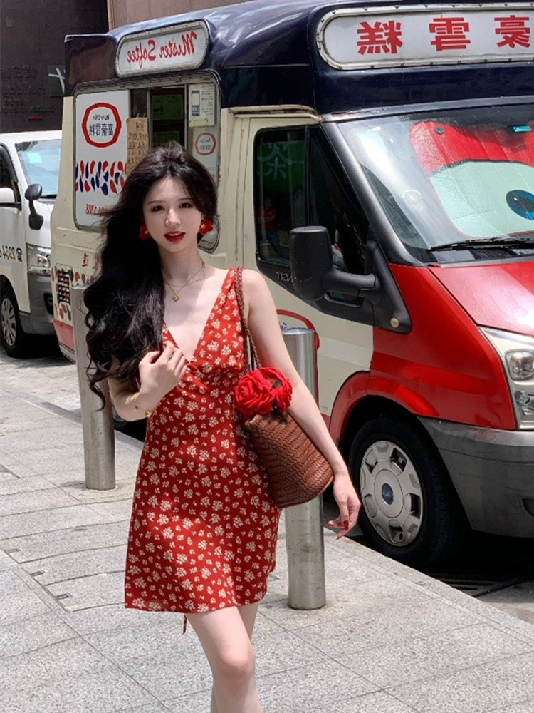 Главная страница > Красное ретро цветочная подтяжка платье женский летний новый чай чистый французский темперамент с V-образным вырезом гонконгского ветра юбка