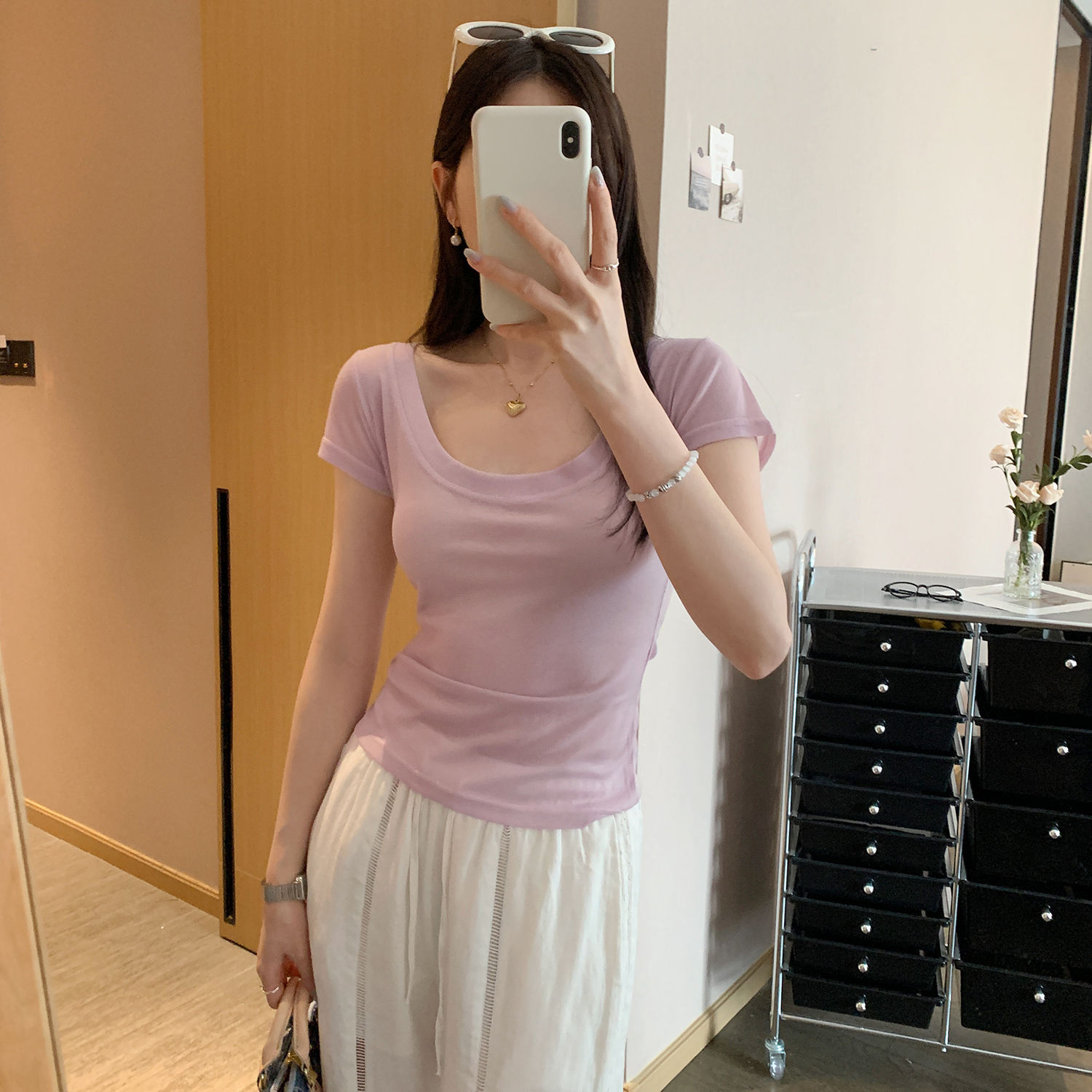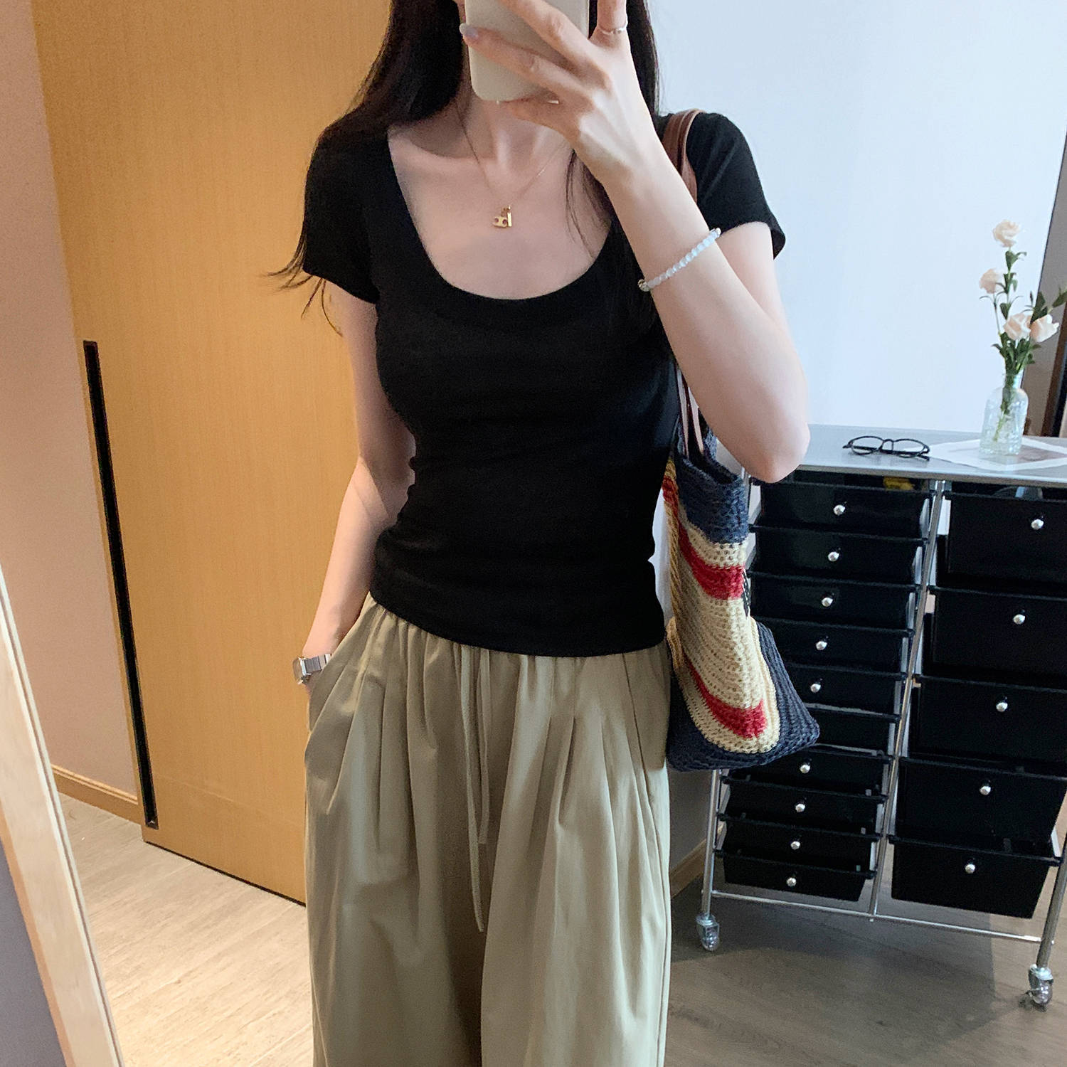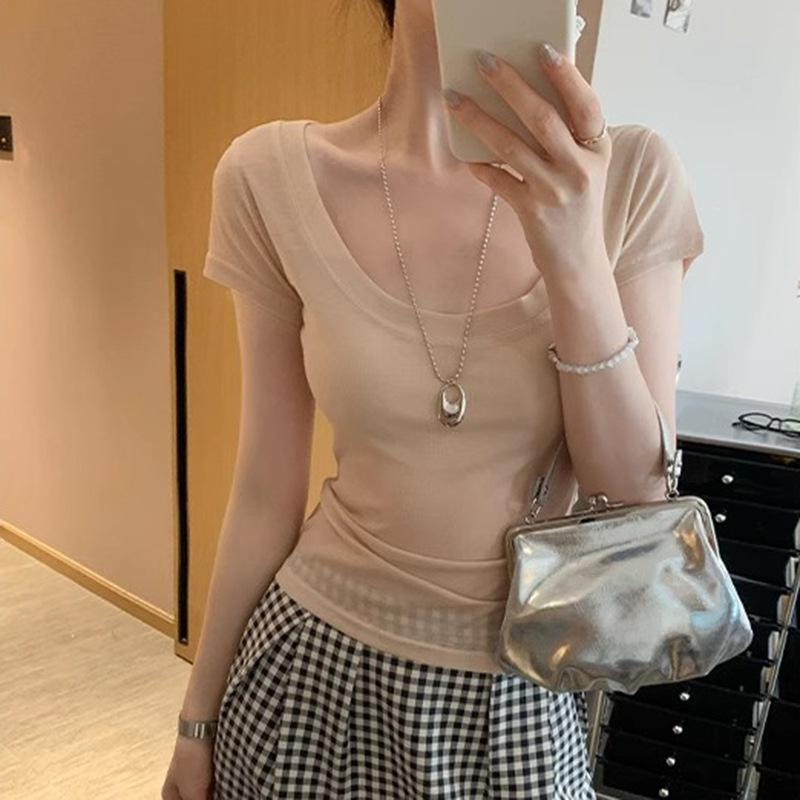 Главная страница > Женская футболка цвета хаки, тонкая, слегка прозрачная, с большим U-образным вырезом, коротким рукавом и правым плечом, летняя новинка 2025 года, свободный крой, чистый стиль.