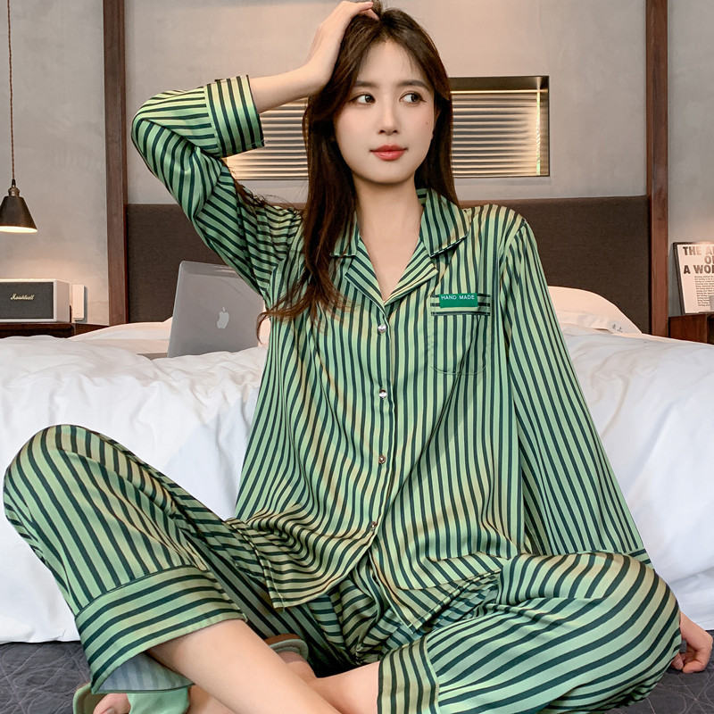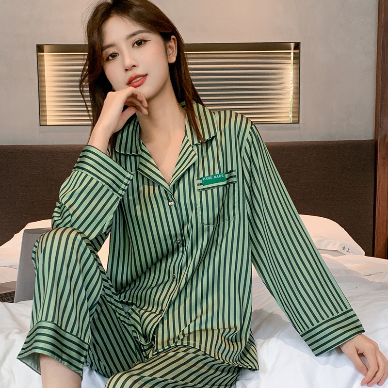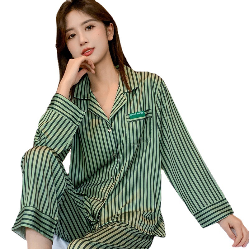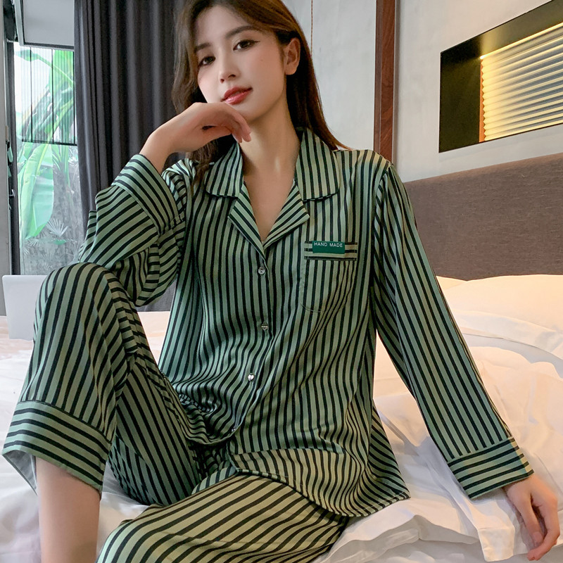 Главная страница > Женские пижамы для весны, лета и осени, тонкий шелк, сексуальный комплект домашней одежды с длинными рукавами, в полоску, с принтом, в стиле «чистое искушение»