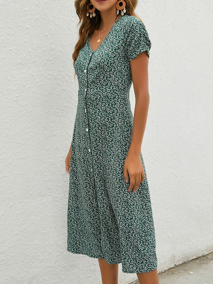 Европейская и американская трансграничная независимая станция экспортирует женскую одежду 2024 весна и лето новое однобортное платье средней длины с v-образным вырезом и цветочным принтом