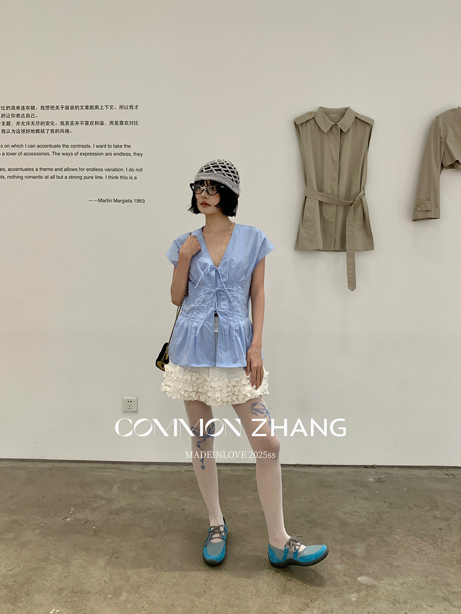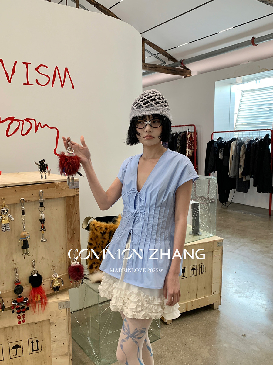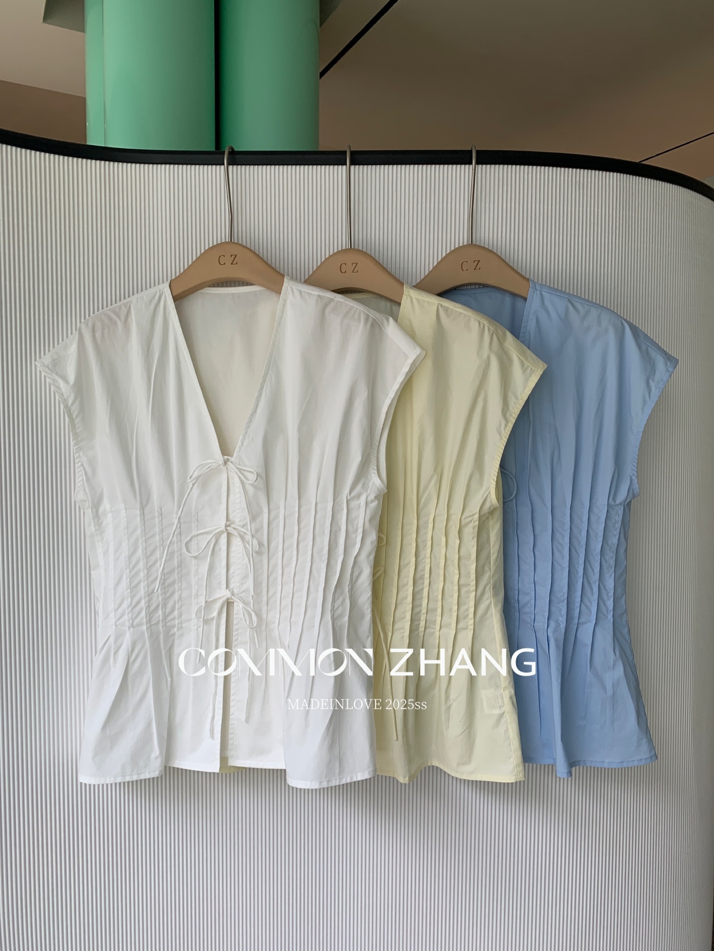 Главная страница > CZ ZHANG Летняя корейская интеллектуальная v-образная столичная шнуровка кардиган без рукавов рубашка женская B23623
