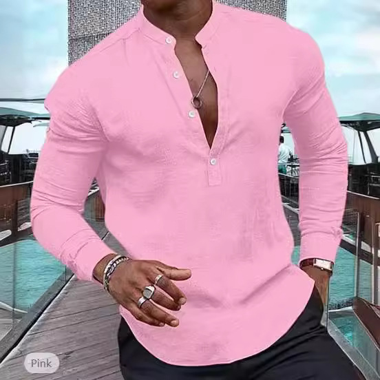 2024 Европейская и американская мужская одежда оптом, мужская повседневная рубашка-пуловер, однотонный полукардиган с длинным рукавом, топ с воротником Генри