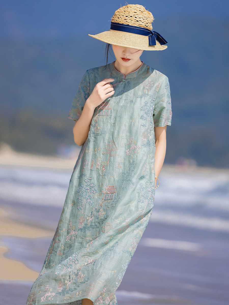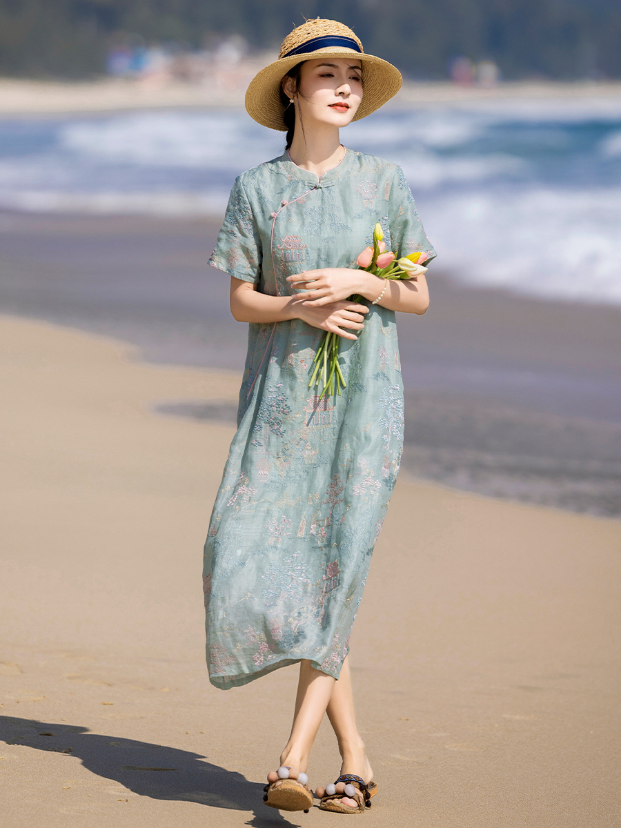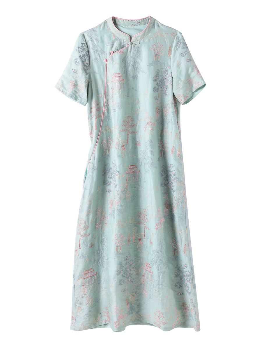 Главная страница > 2024 Весна и лето новый китайский стиль павильон вышивка рами улучшенное Чонсам с коротким рукавом стойка воротник пряжка художественное платье
