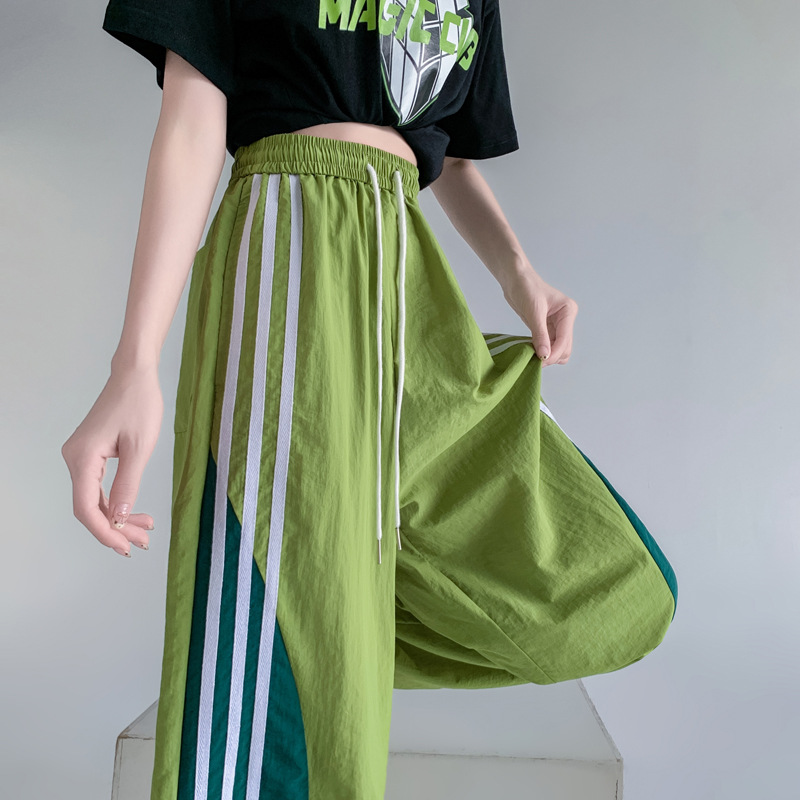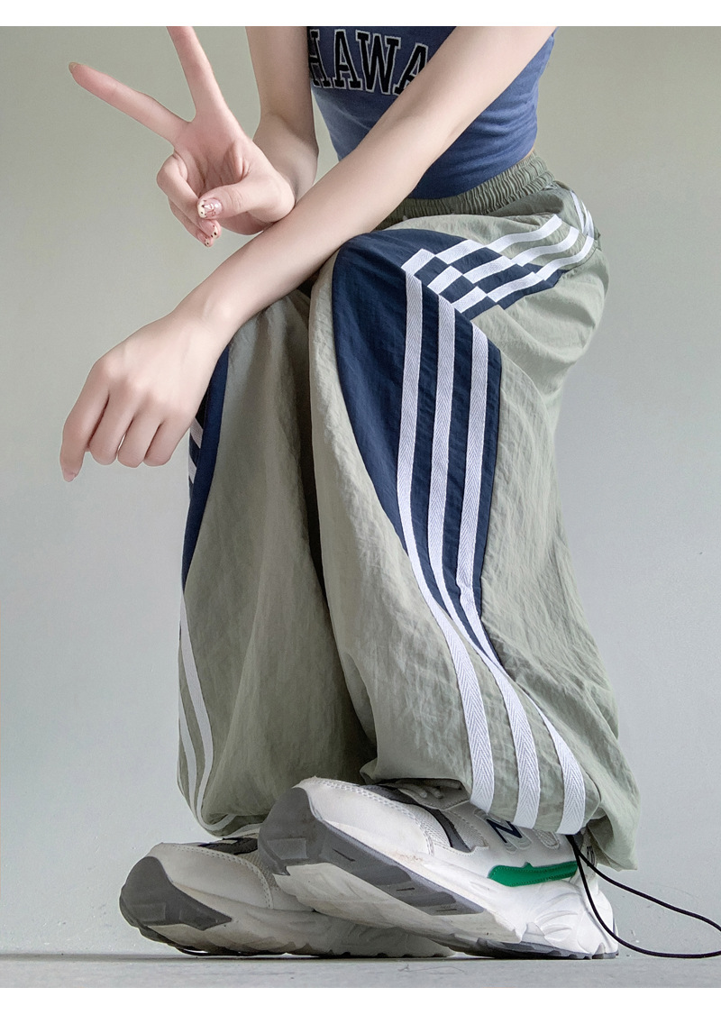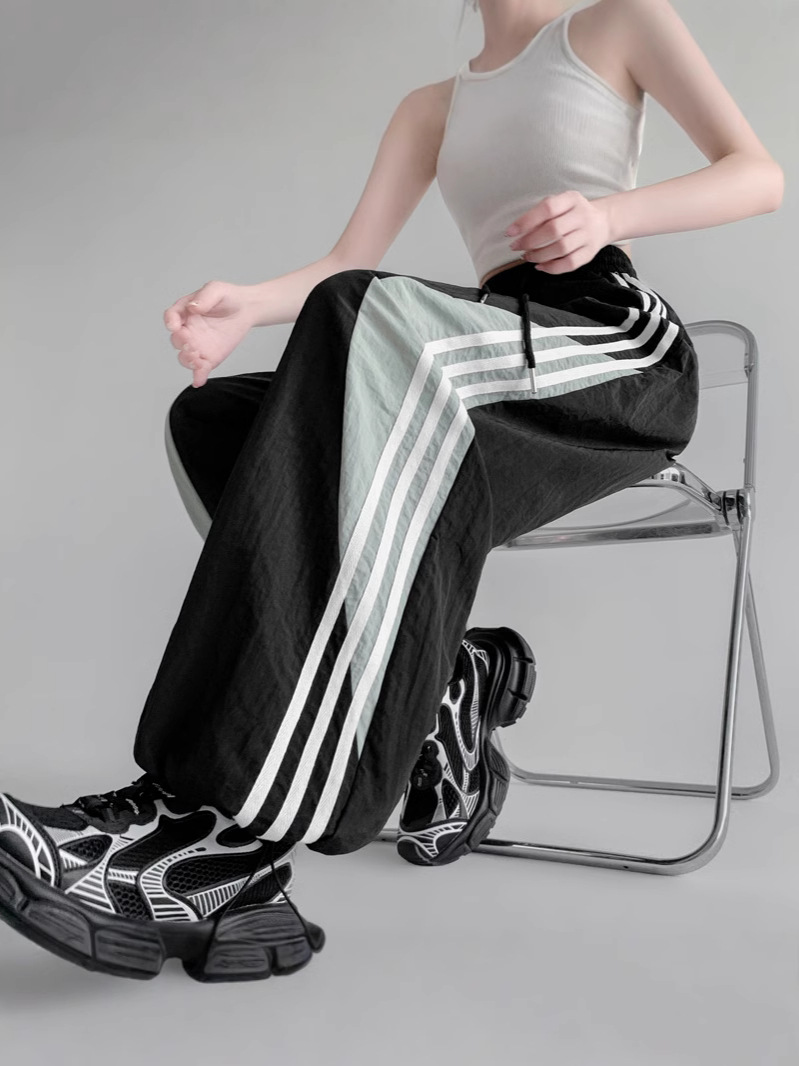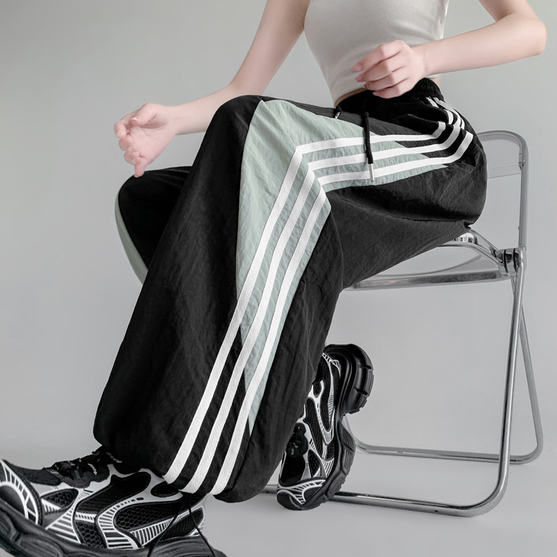 Главная страница > Американские высокие уличные спортивные брюки женские весной и летом с высокой талией повседневная прямая полоска сшивания свободные комбинезоны широкие брюки