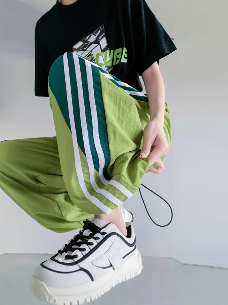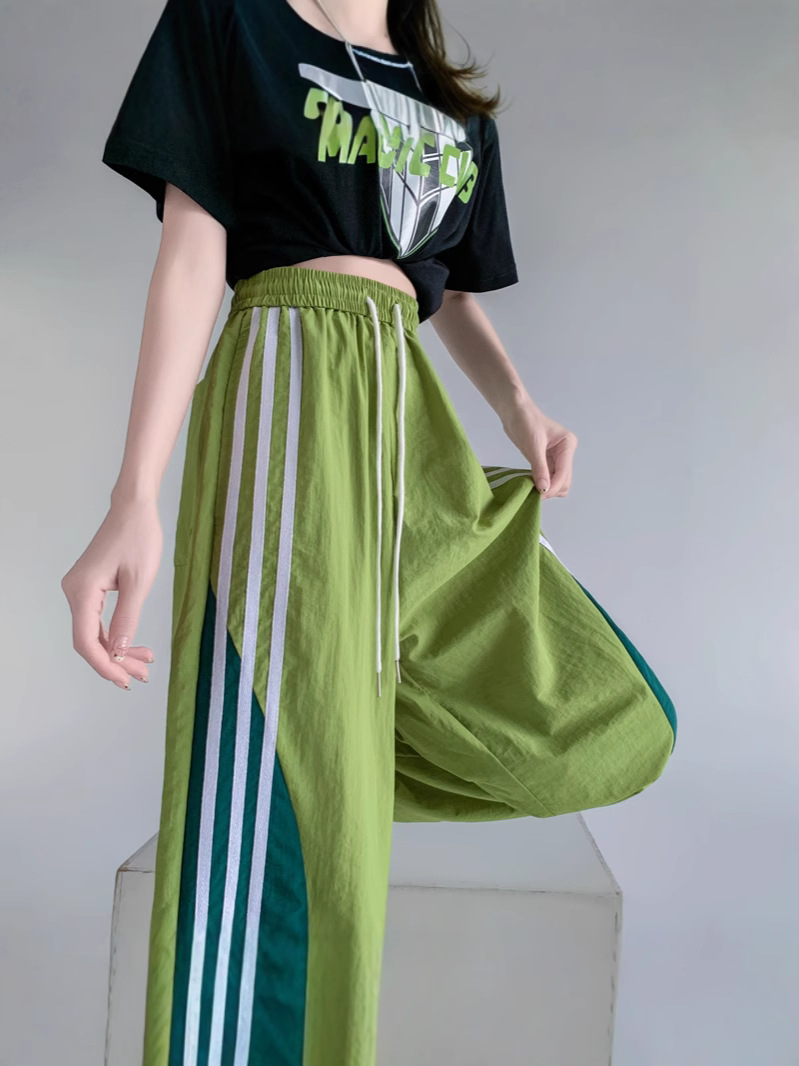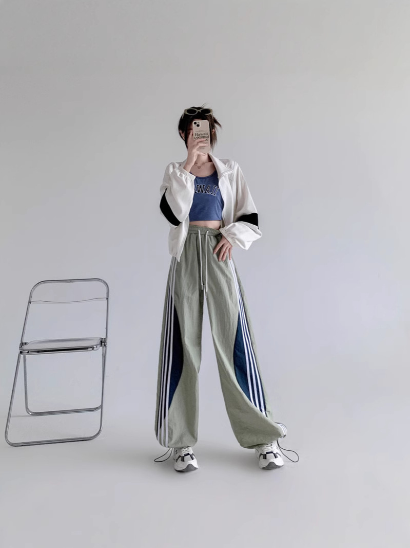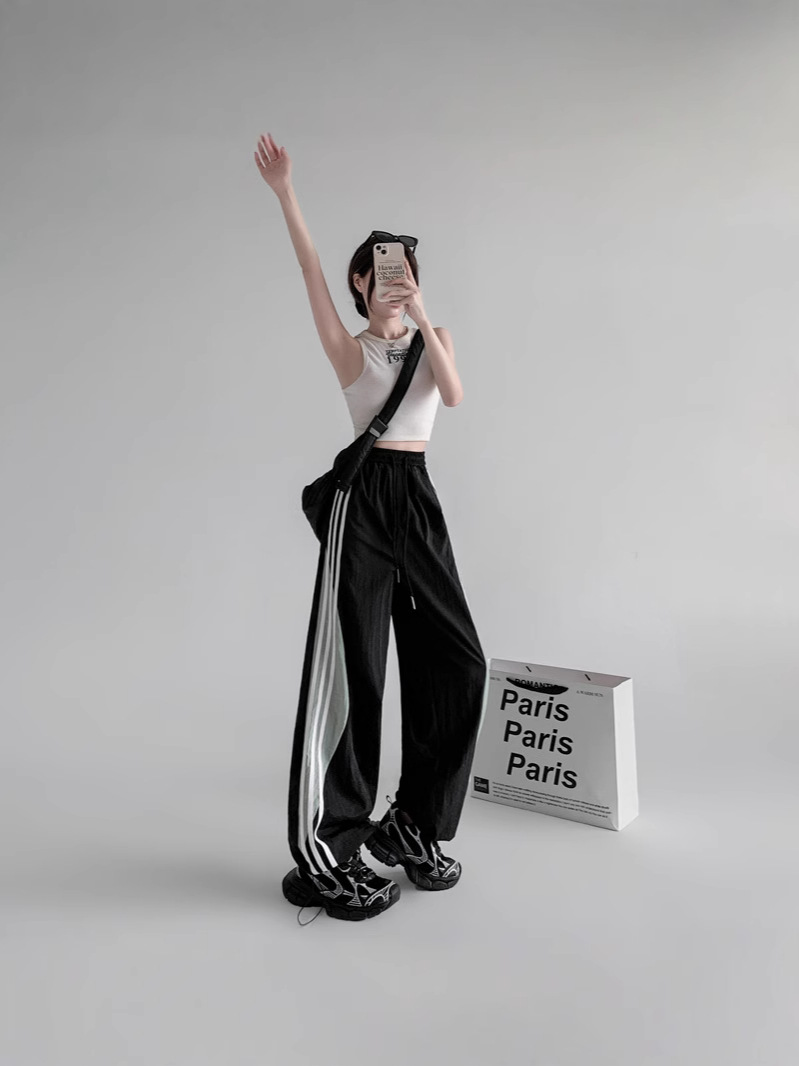 Главная страница > Американские высокие уличные спортивные брюки женские весной и летом с высокой талией повседневная прямая полоска сшивания свободные комбинезоны широкие брюки