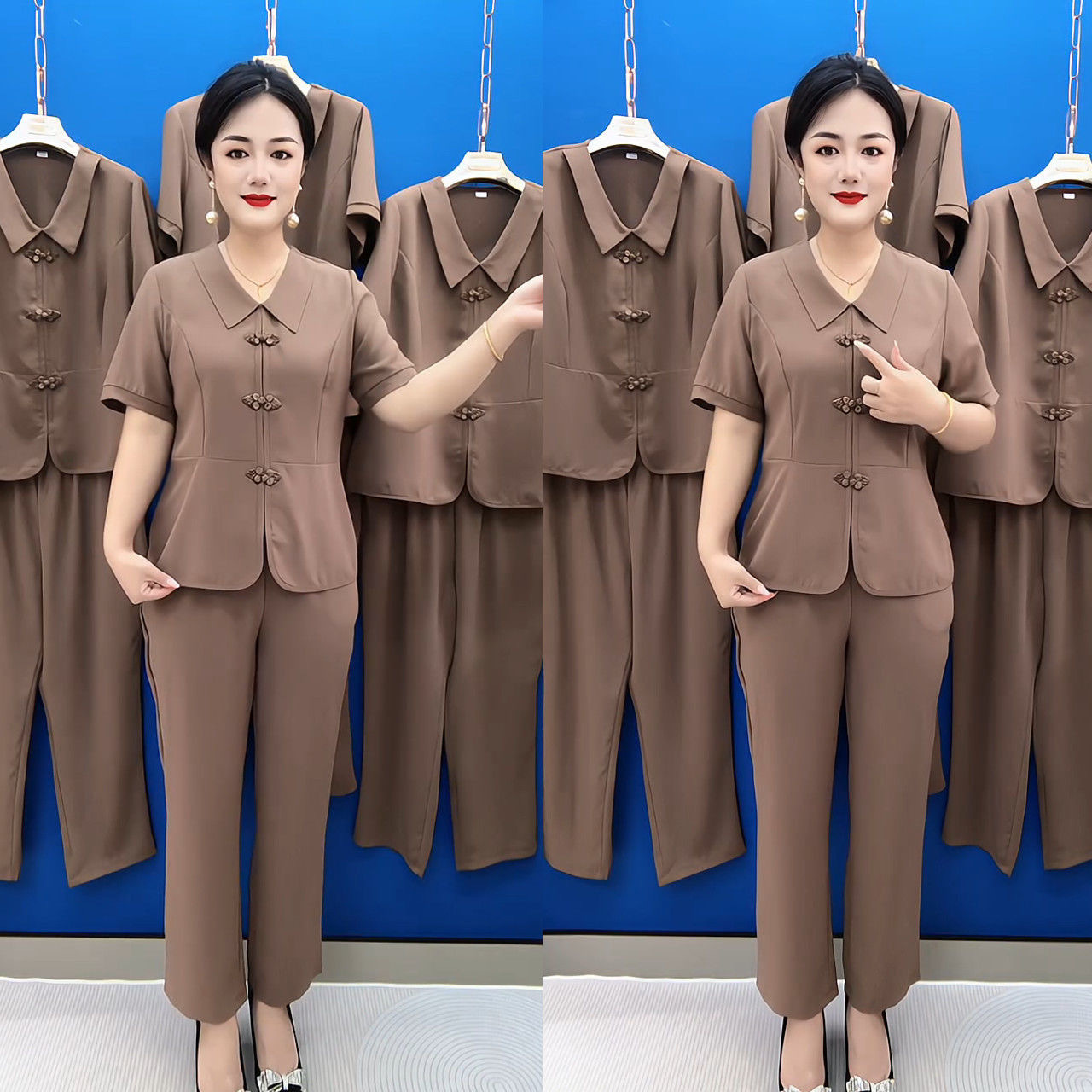 Оптовая продажа до 2025 ретро пряжка летняя мама новая мода с короткими рукавами сплошной цвет набор из двух частей для женщин