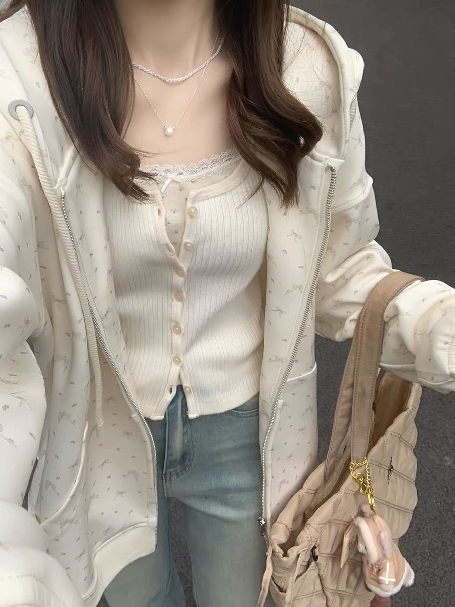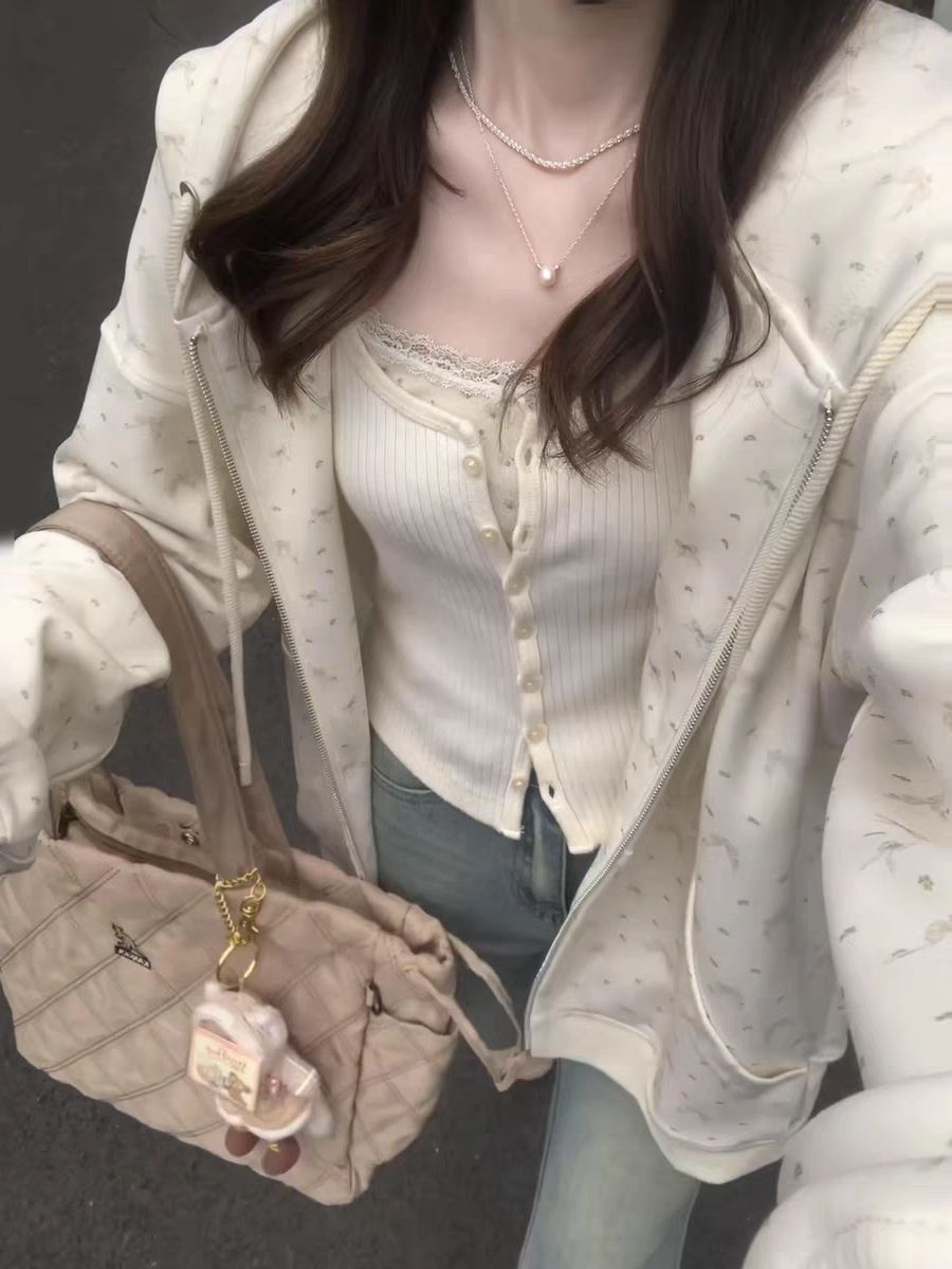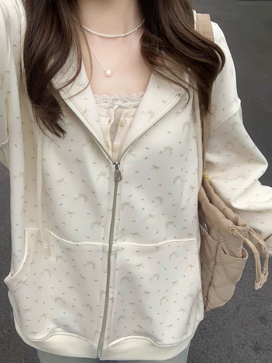 Лук с цветочным свитером куртка женская весна и осень с капюшоном