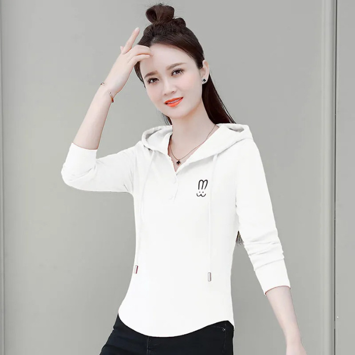 Оптовая весна и осень с капюшоном темперамент свободный с длинными рукавами 2024 новый ледяной шелк с ниткой женский тонкий топ-футболка