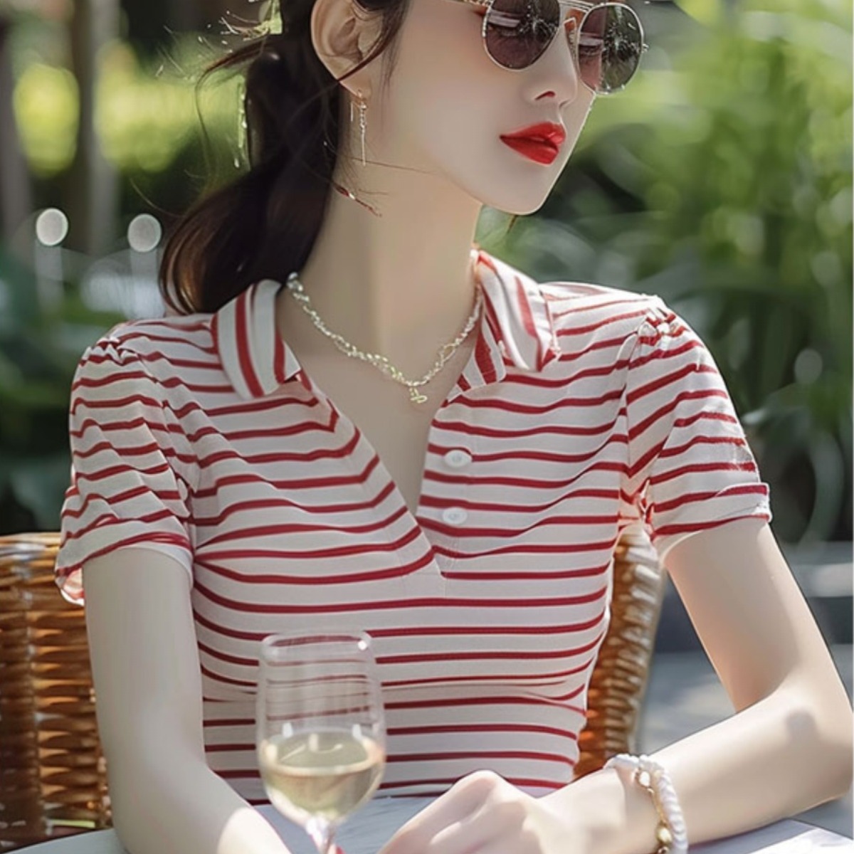 Главная страница > Хорошее качество хлопчатобумажная футболка из ткани в полоску POLO воротник с короткими рукавами плечо футболка иностранная мода модный топ для женщин