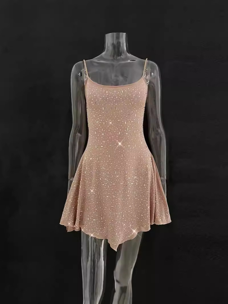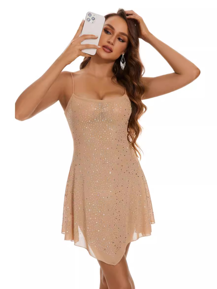 2024 Трансграничная амазонка Горячая Дрель Полусоркий Сексуальная Горячая Девушка Прозорная Ремень Короткое Платье Женское