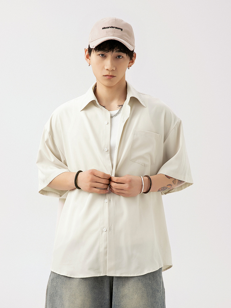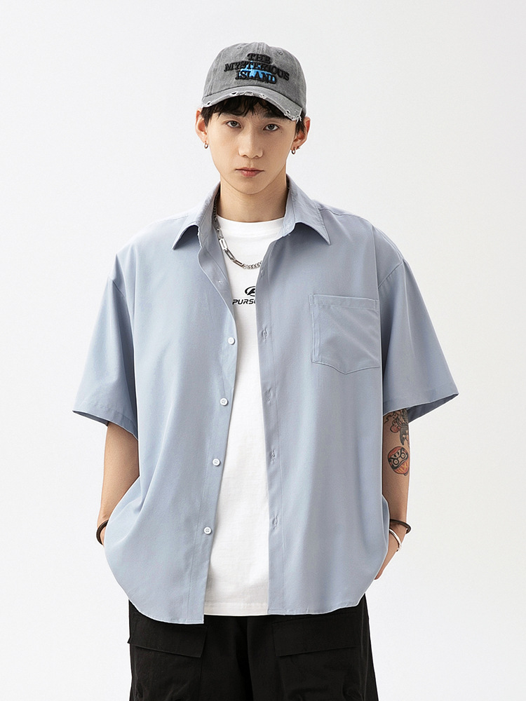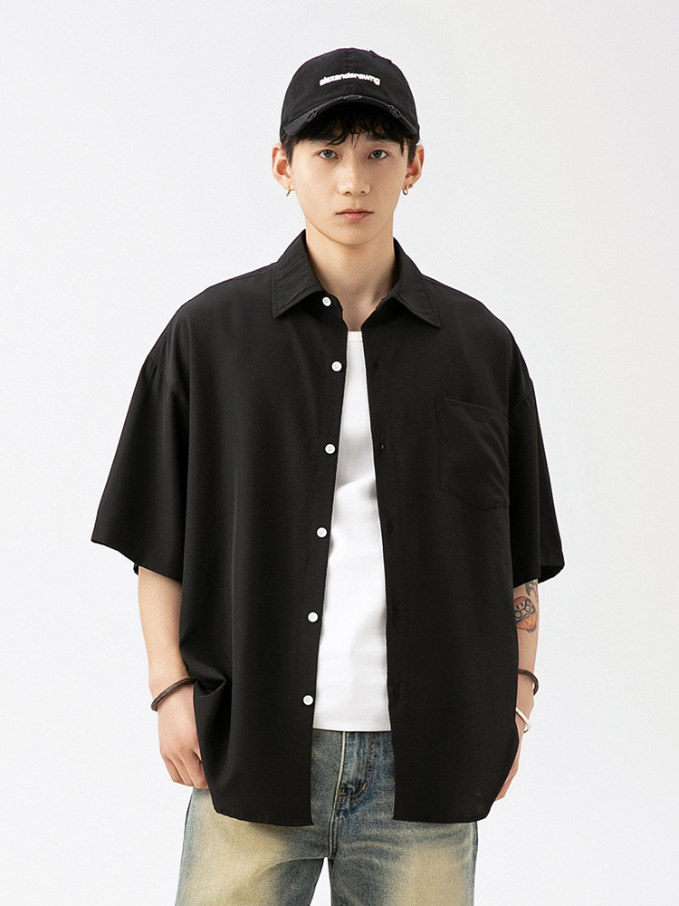 Главная страница > Мужская одежда Hanlu. Гладкая и драпированная мужская рубашка с коротким рукавом, новая летняя однотонная повседневная свободная куртка-рубашка для пар Q.