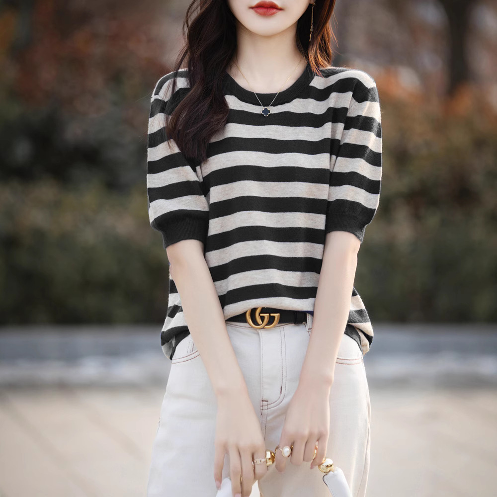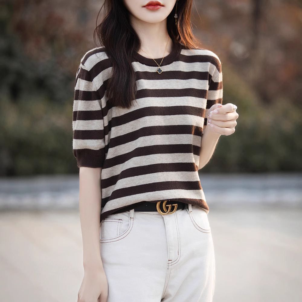 Главная страница > Оптовая продажа 2025 летний новый женский вязаный свитер Энди с короткими рукавами женский свитер с круглым вырезом в полоску свитер свитер
