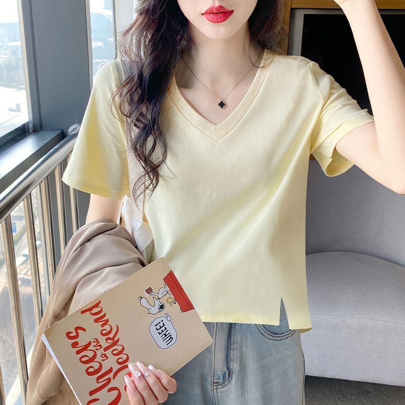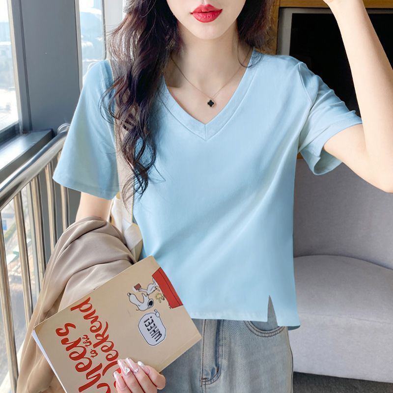 [Светло-синий]-разрез по краю с V-образным вырезом/стиль хлопка