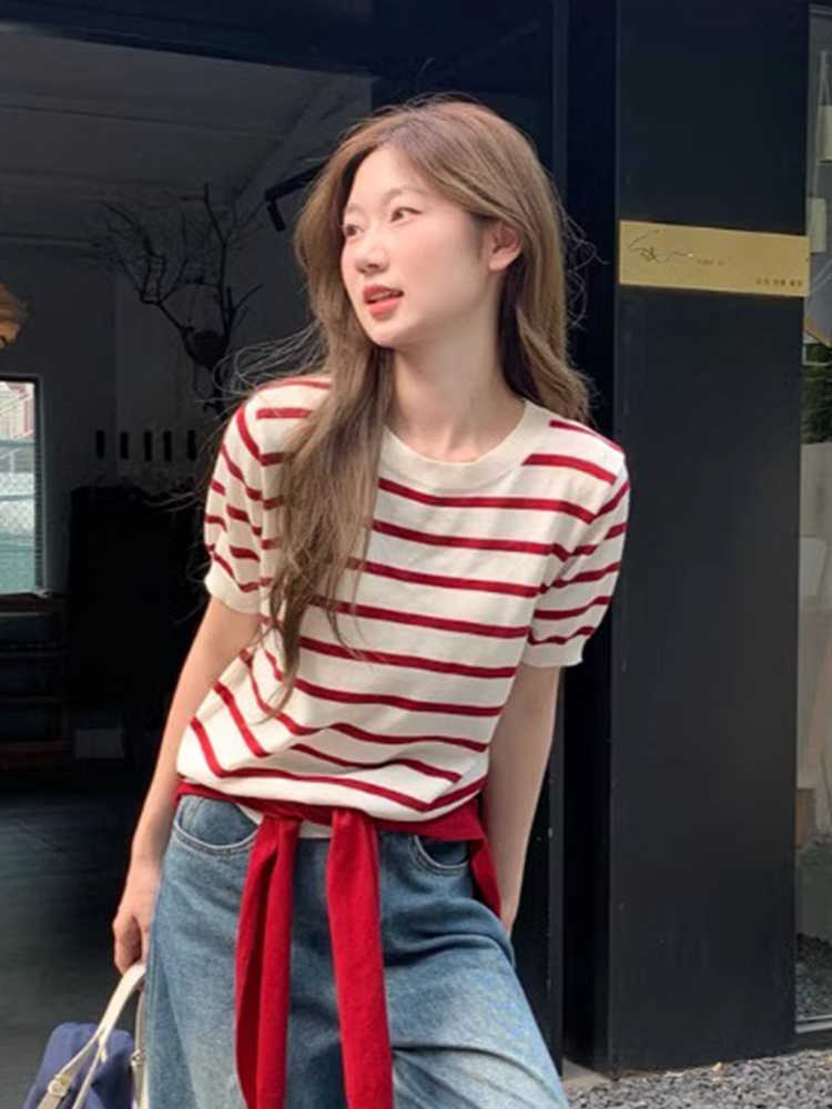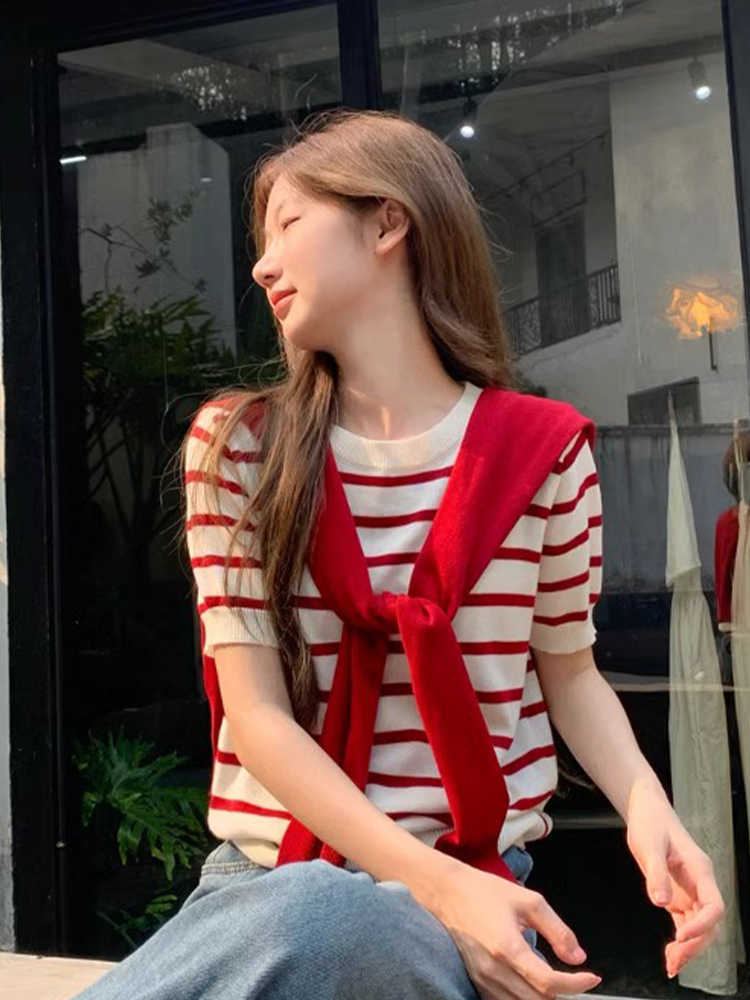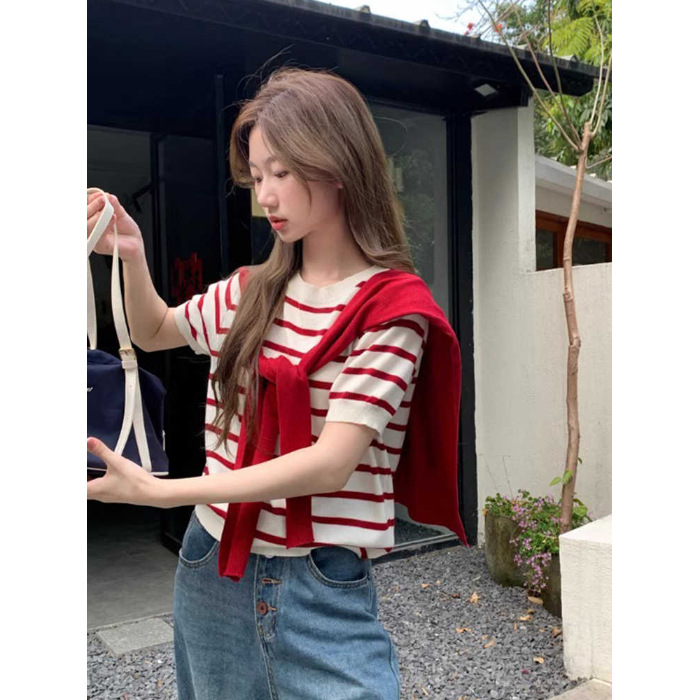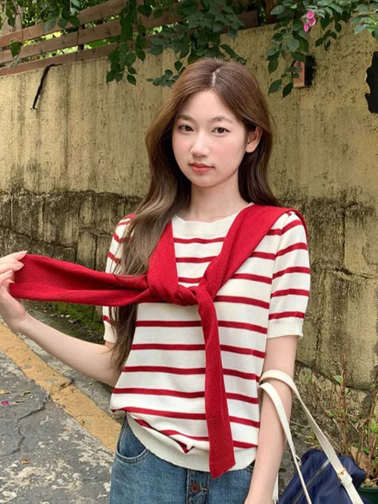 Главная страница > Красно-белый полосатый комплект из шали и футболки: женский летний свободный вязаный топ в корейском стиле, новинка