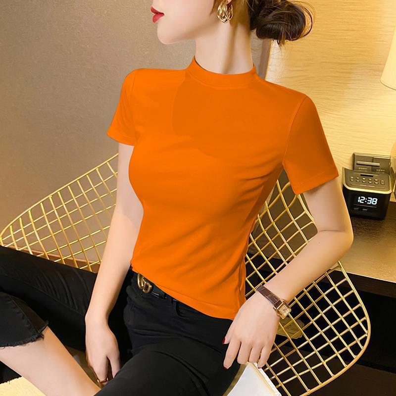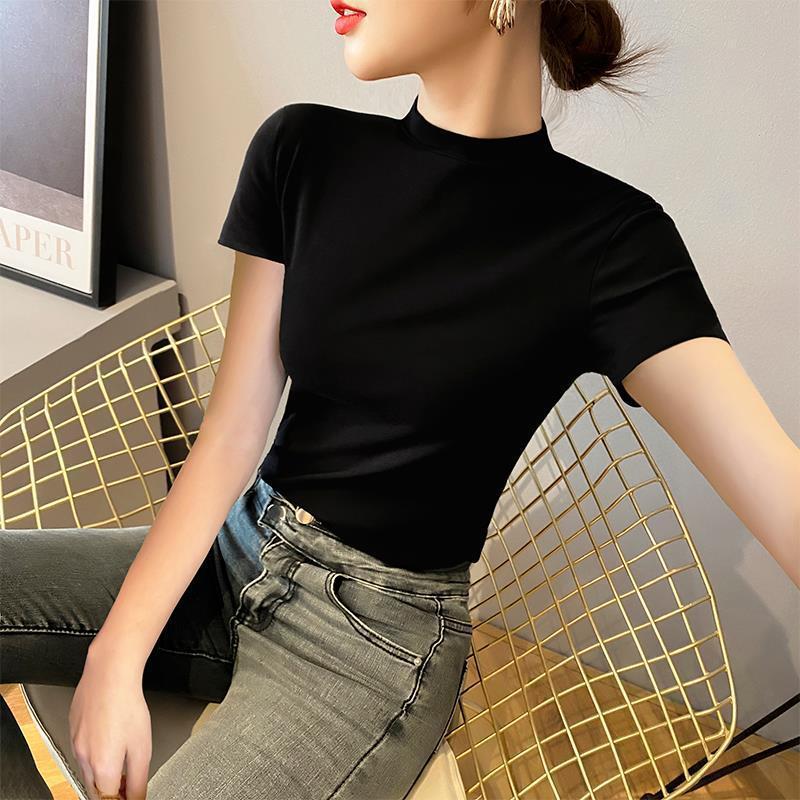 Черная женская футболка с короткими рукавами и полугольфом, новинка 2024 года, модная весенне-летняя рубашка с низом, облегающий топ из чистого хлопка со средним воротником