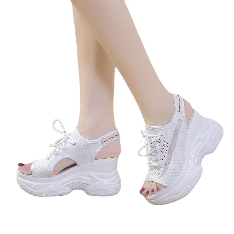 Босоножки на танкетке женские летние Новые дышащие сетчатые сандалии на толстой подошве на шнуровке с рыбьим ртом, повседневные спортивные сандалии, оптовая продажа