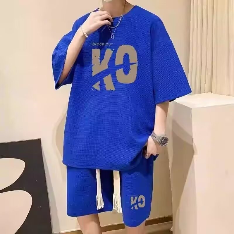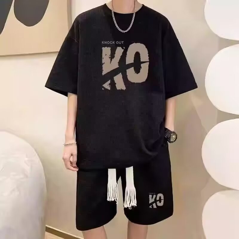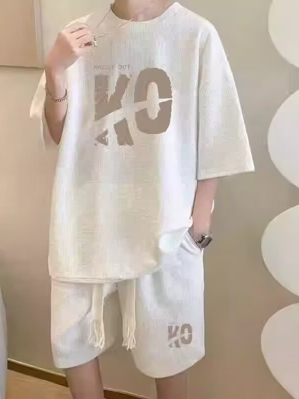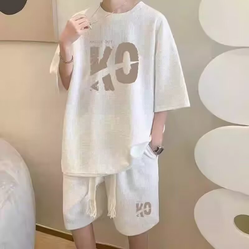 Летний спортивный повседневный вафли набор мужской корейской версии с круглым вырезом с короткими рукавами повседневный комфорт и красивый набор из двух частей