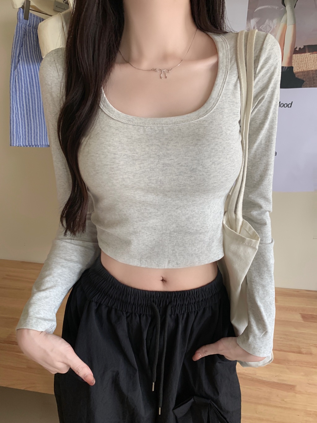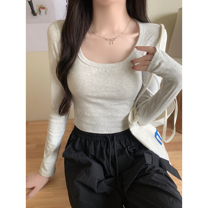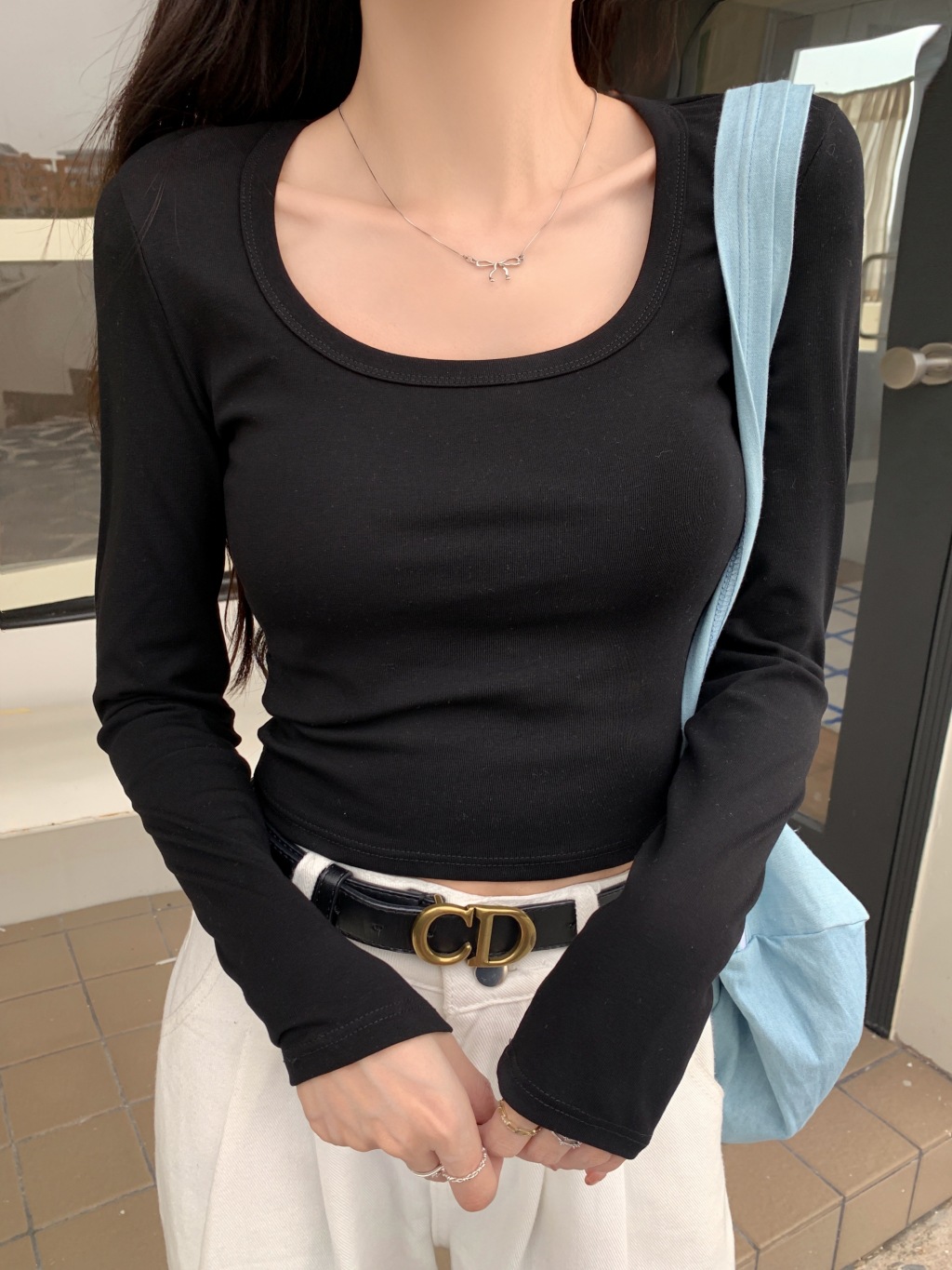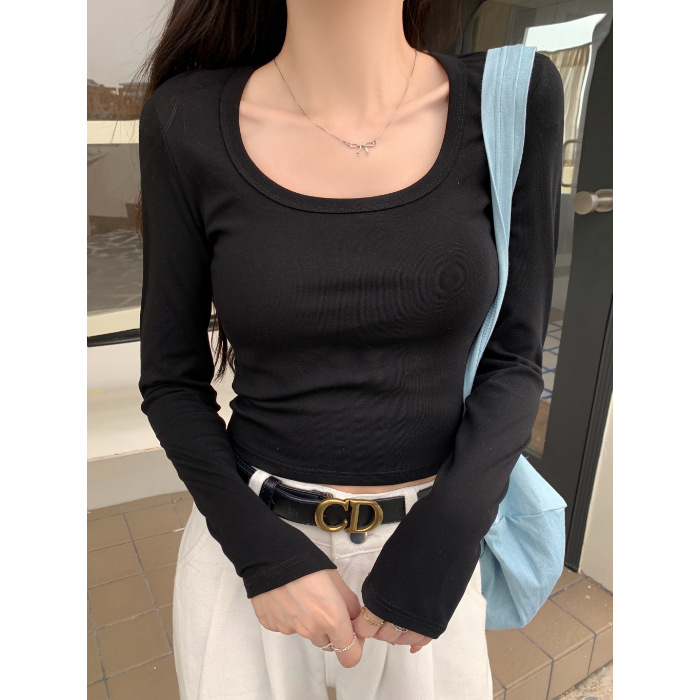 Главная страница > Маленькая корейская версия тонкая футболка с U-образным вырезом для женской осенней хлопчатобумажной основы