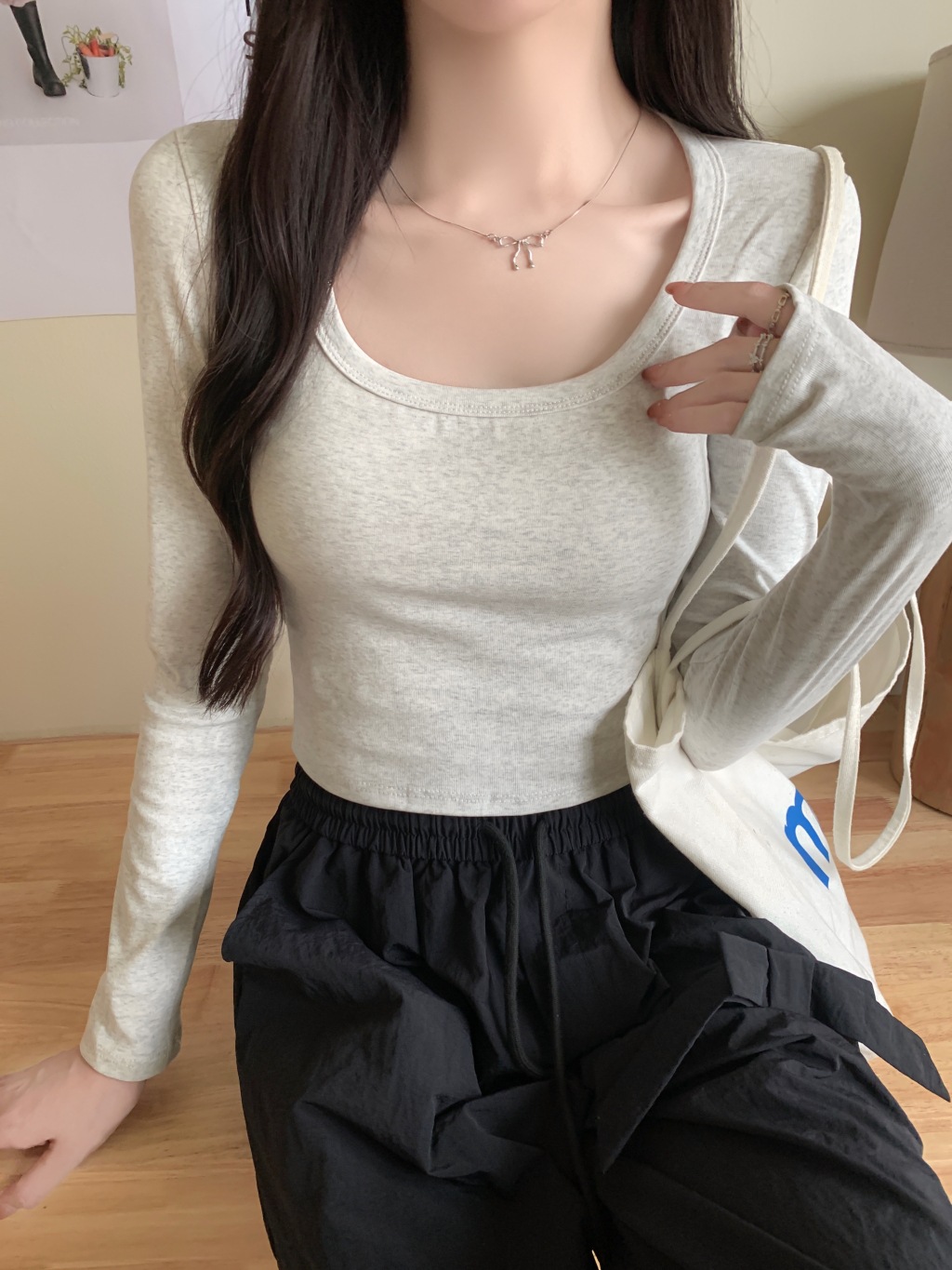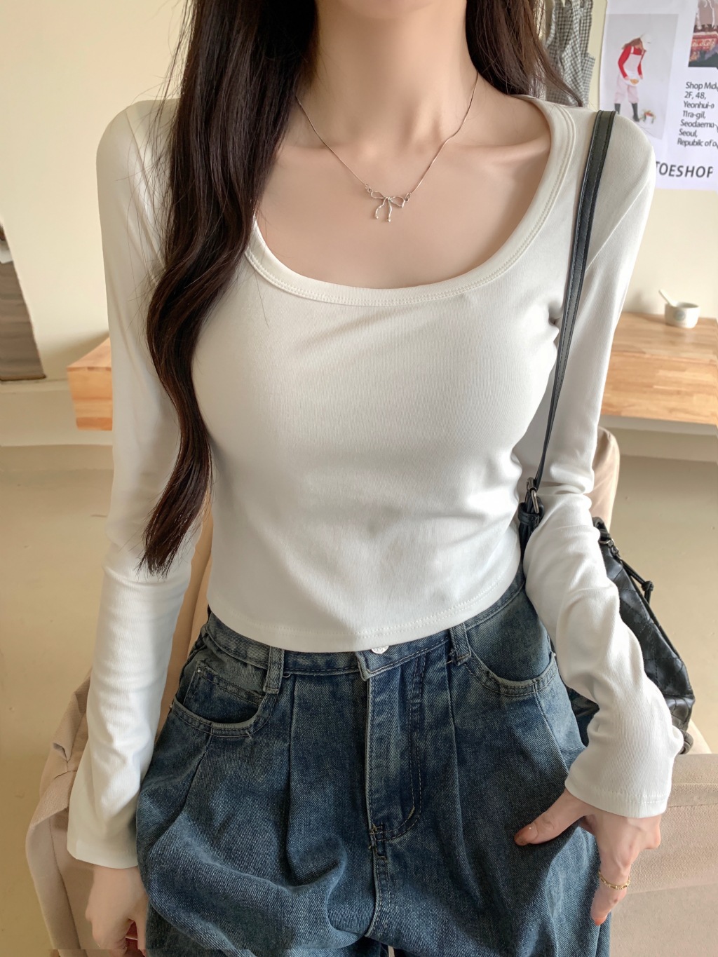 Маленькая корейская версия тонкая футболка с U-образным вырезом для женской осенней хлопчатобумажной основы