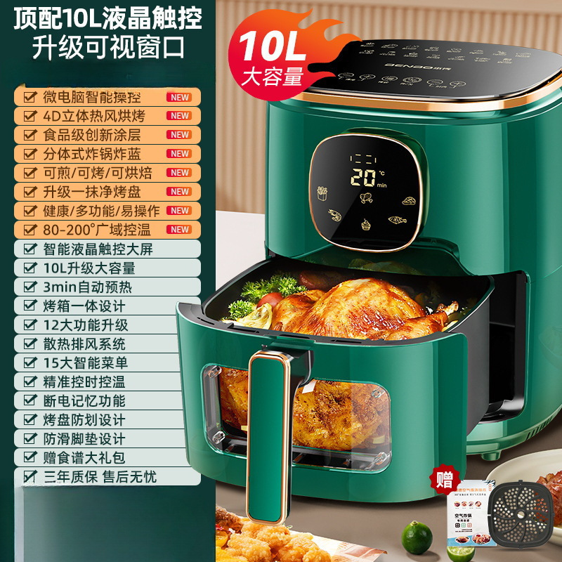 [Топ с сенсорным экраном/зеленый 10,0 л] Модернизированная большая емкость + 15 больших интеллектуальных меню + высокая огневая мощь 1400 Вт + трехмерная выпечка горячим воздухом 4D + без масла и без масла