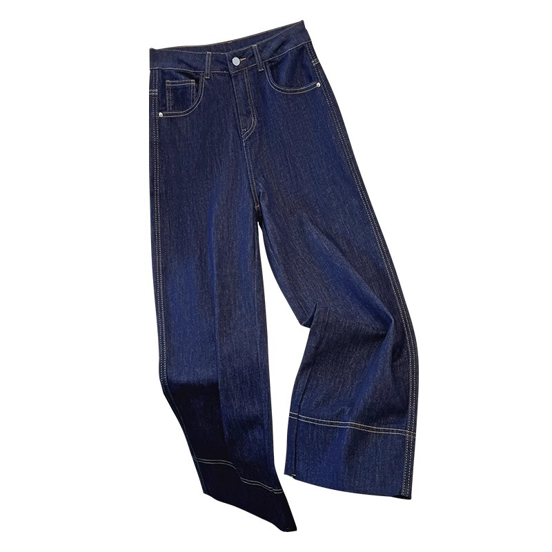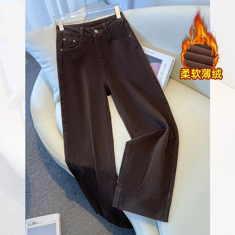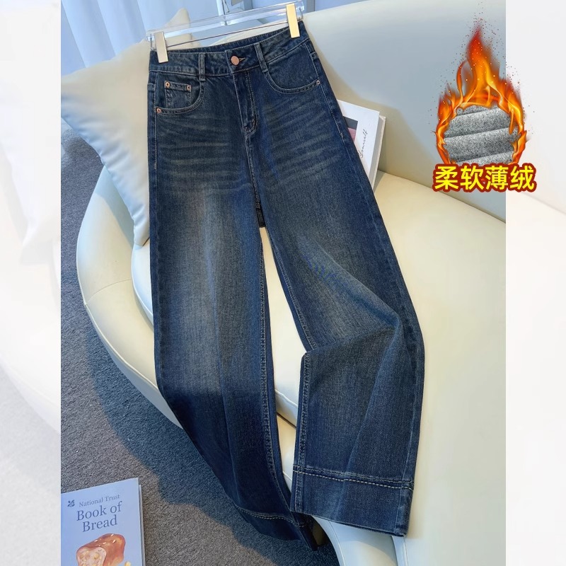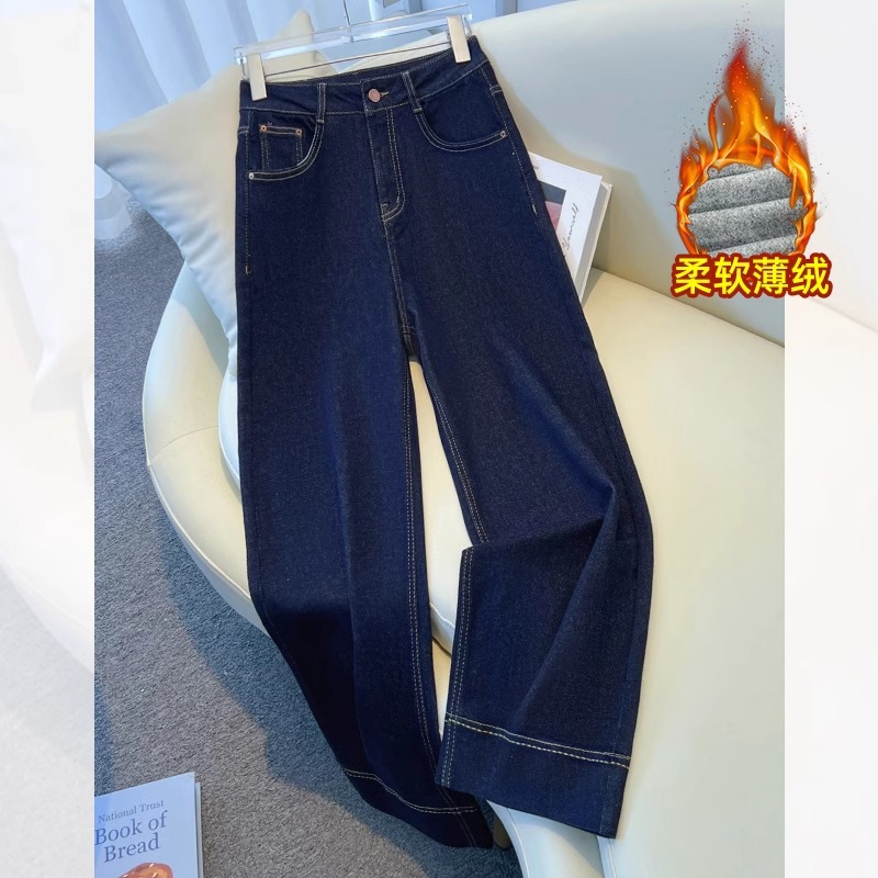 Главная страница > Элегантные женские джинсы с высокой талией, прямого кроя, укороченные, на флисовой подкладке, темно-синие, широкие штанины, осень-зима 2025