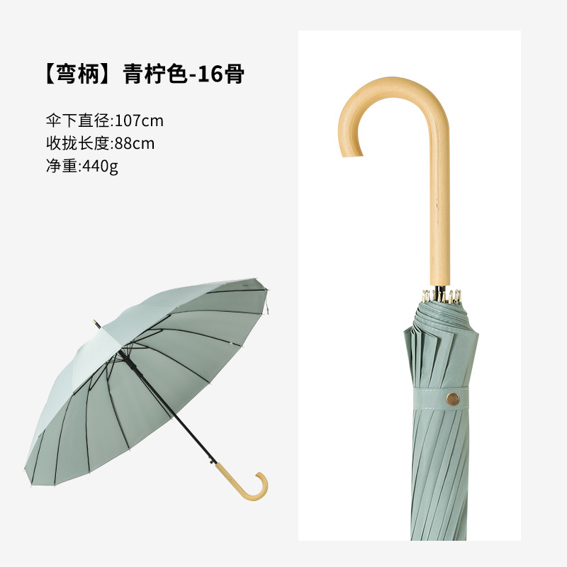 Зонт с длинной ручкой из 16 костей и увеличенным цветом лайма (изогнутая ручка из цельного дерева)
