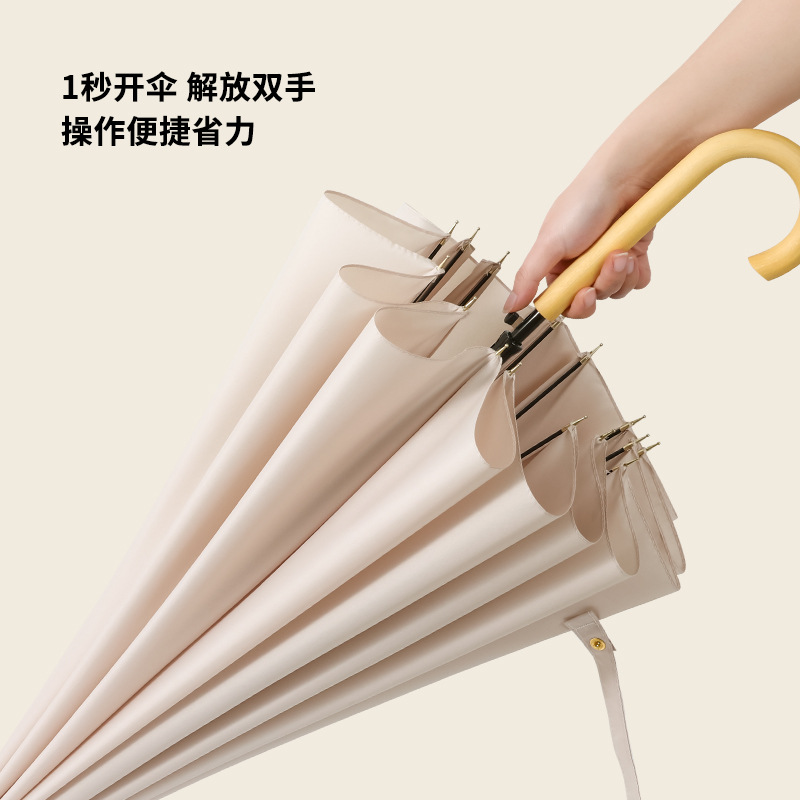Зонт с длинной ручкой на 16 костей молочно-белого цвета (изогнутая ручка из цельного дерева)