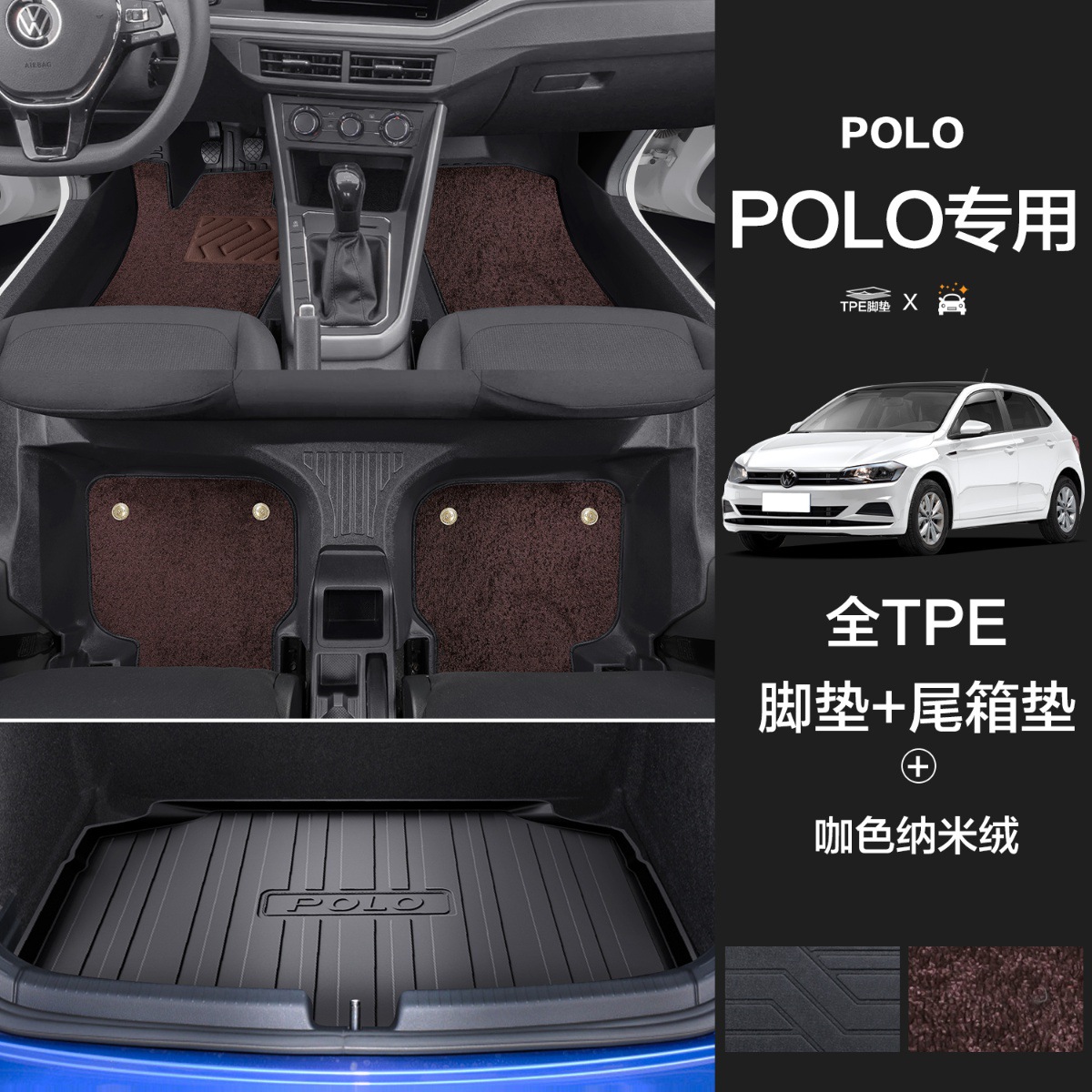 大众POLO【TPE包门槛脚垫】+咖色纳米绒+TPE后备箱垫