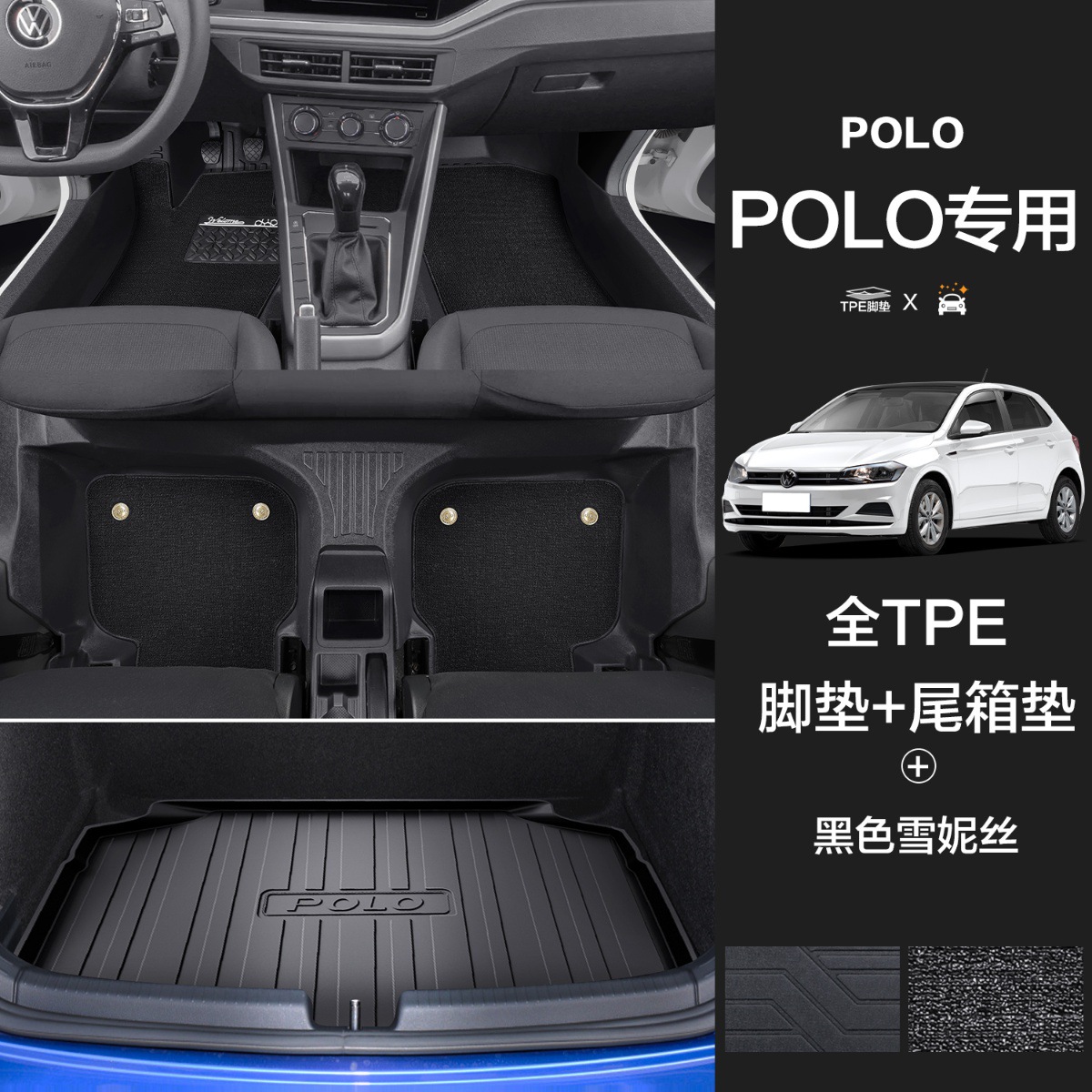大众POLO【TPE包门槛脚垫】+黑色雪妮丝+TPE后备箱垫