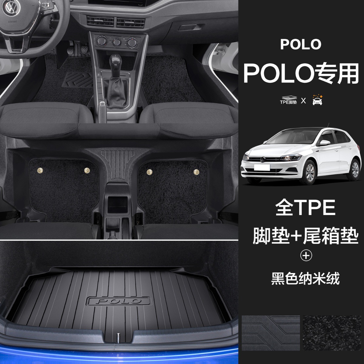大众POLO【TPE包门槛脚垫】+黑色纳米绒+TPE后备箱垫