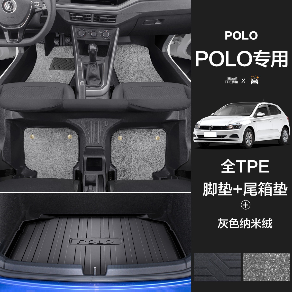 大众POLO【TPE包门槛脚垫】+灰色纳米绒+TPE后备箱垫