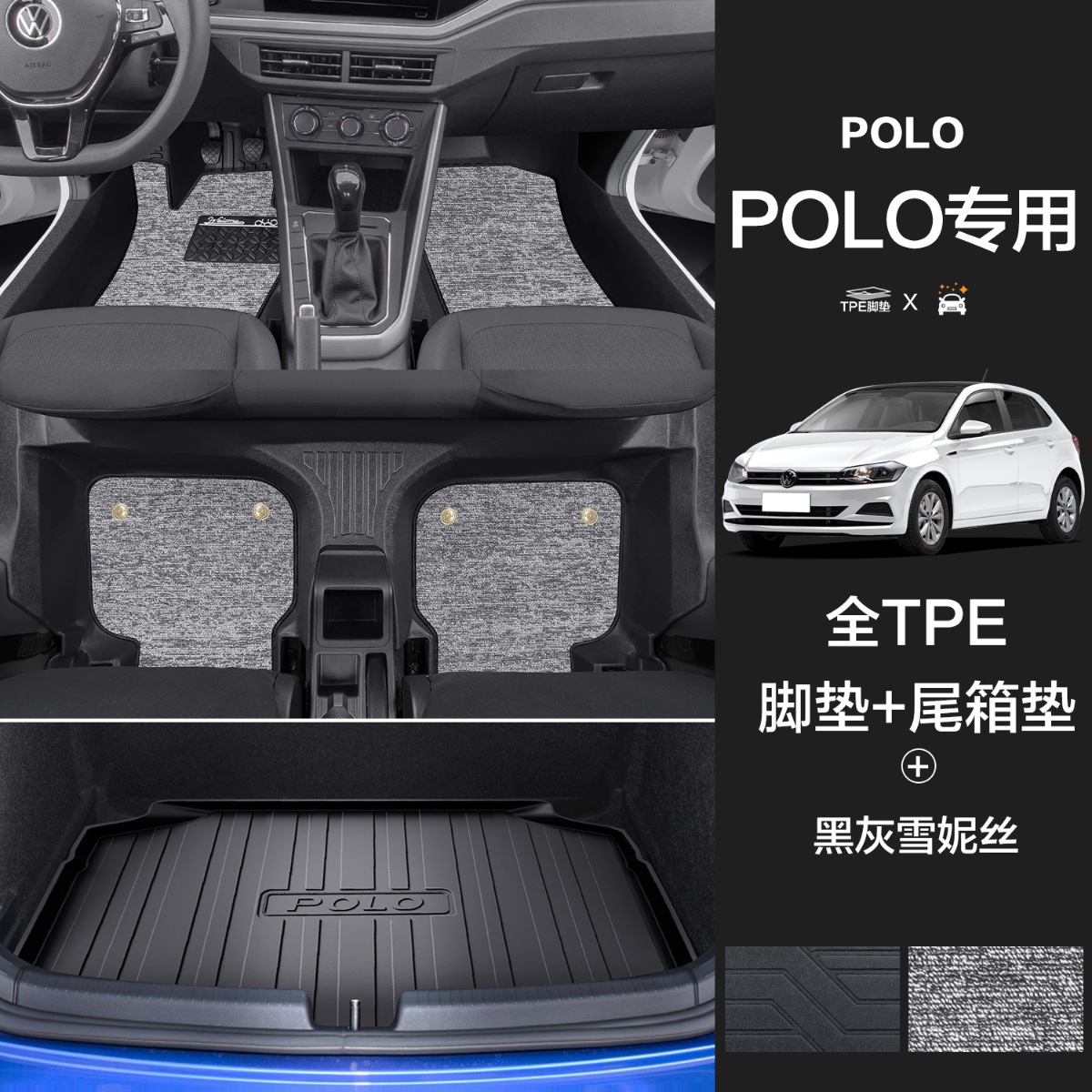 大众POLO【TPE包门槛脚垫】+黑灰雪妮丝+TPE后备箱垫