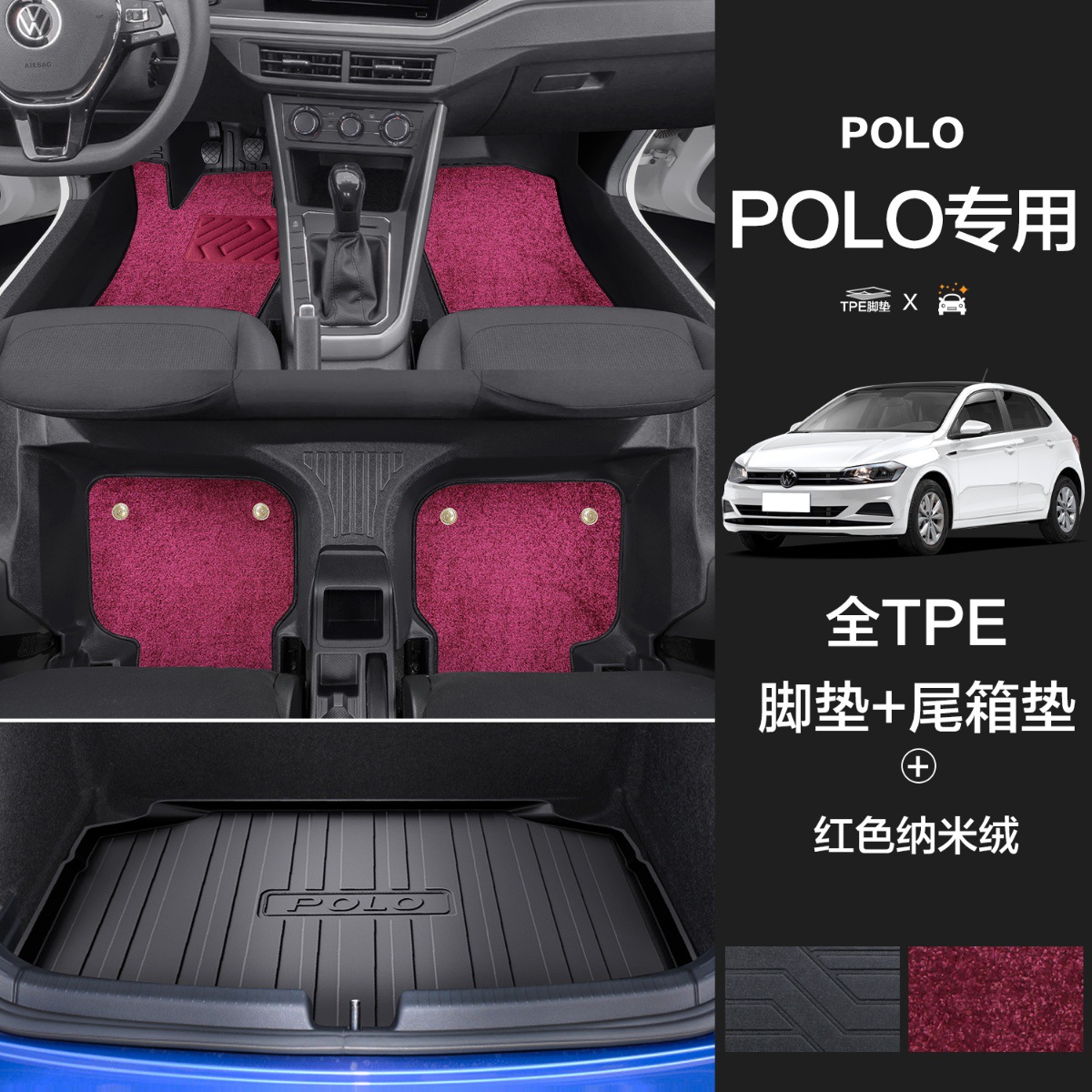 大众POLO【TPE包门槛脚垫】+酒红纳米绒+TPE后备箱垫