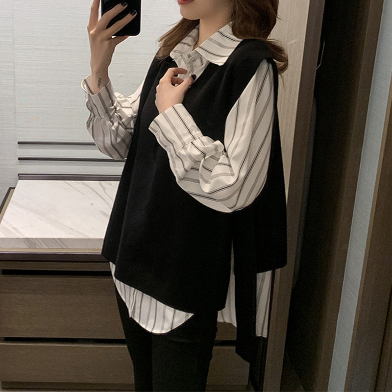 Главная страница > Комплект из рубашки с воротником-поло в вертикальную полоску и черного вязаного жилета для женщин, новинка весны 2025, модный топ в корейском стиле