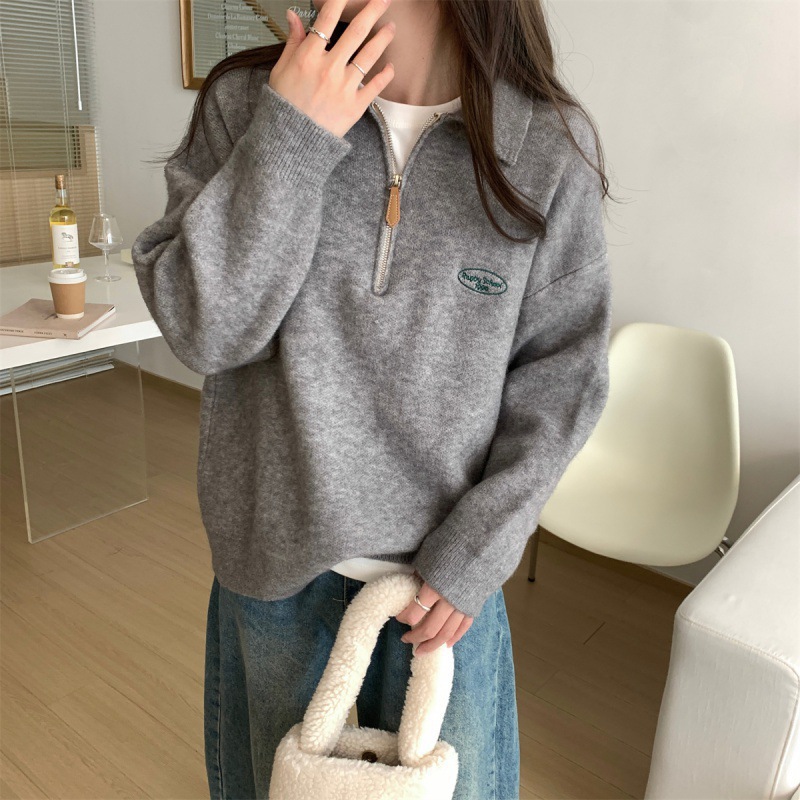 Главная страница > Новый воротник поло половина молния дизайн пуловер свитер Топ женские свободные пальто вышитые письмо утолщенные свитер