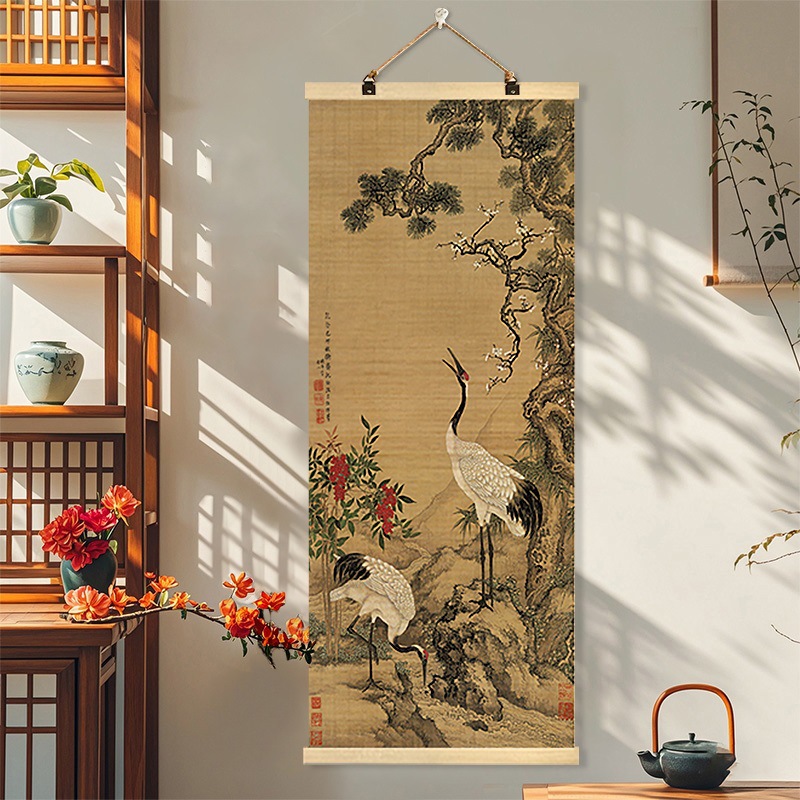10-дюймовая картина «Сосна, слива и двойной кран» [материал из натурального бамбука]