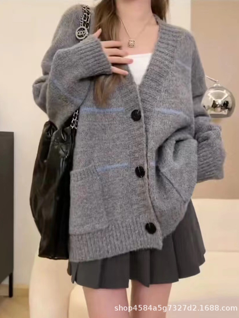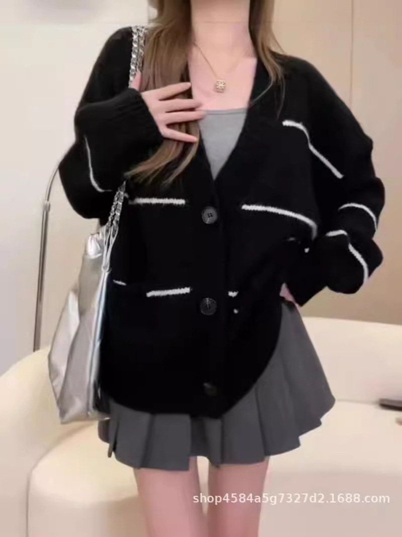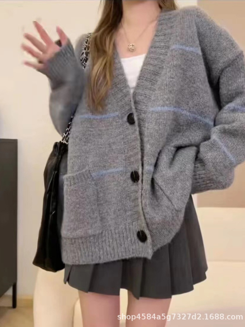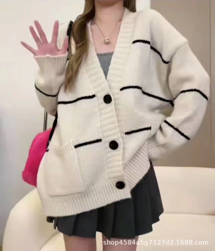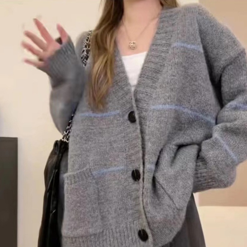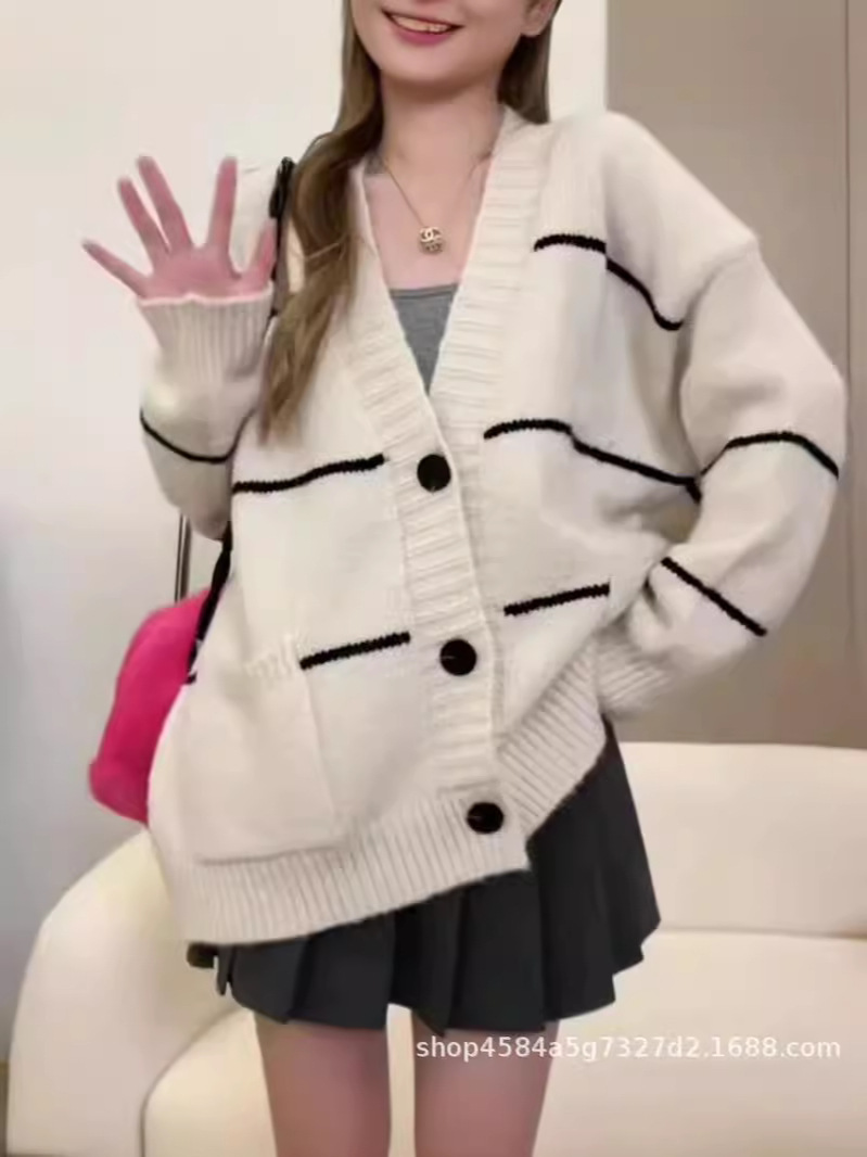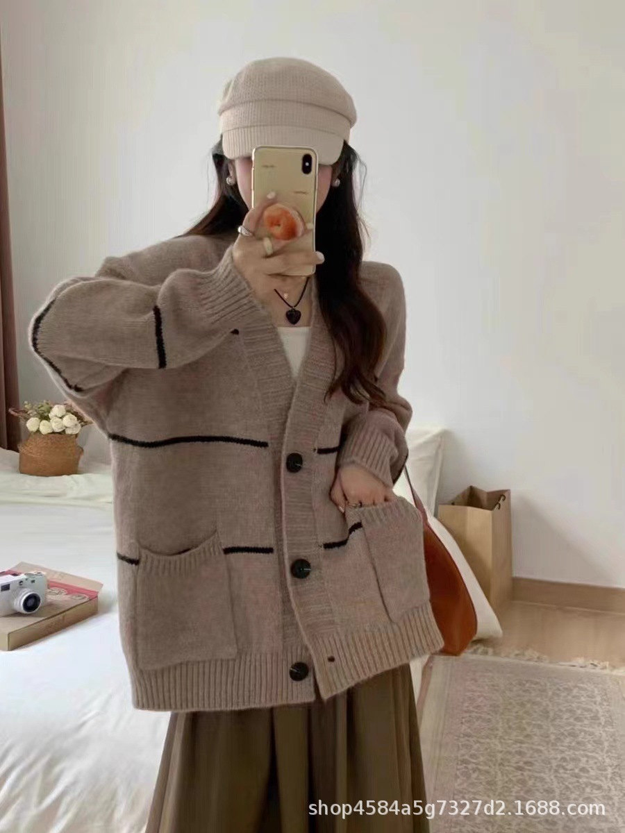 Главная страница > Весенне-осенний новый вязаный свитер в полоску с v-образным вырезом, толстый женский свободный и универсальный дизайн, нишевая верхняя одежда в ленивом стиле