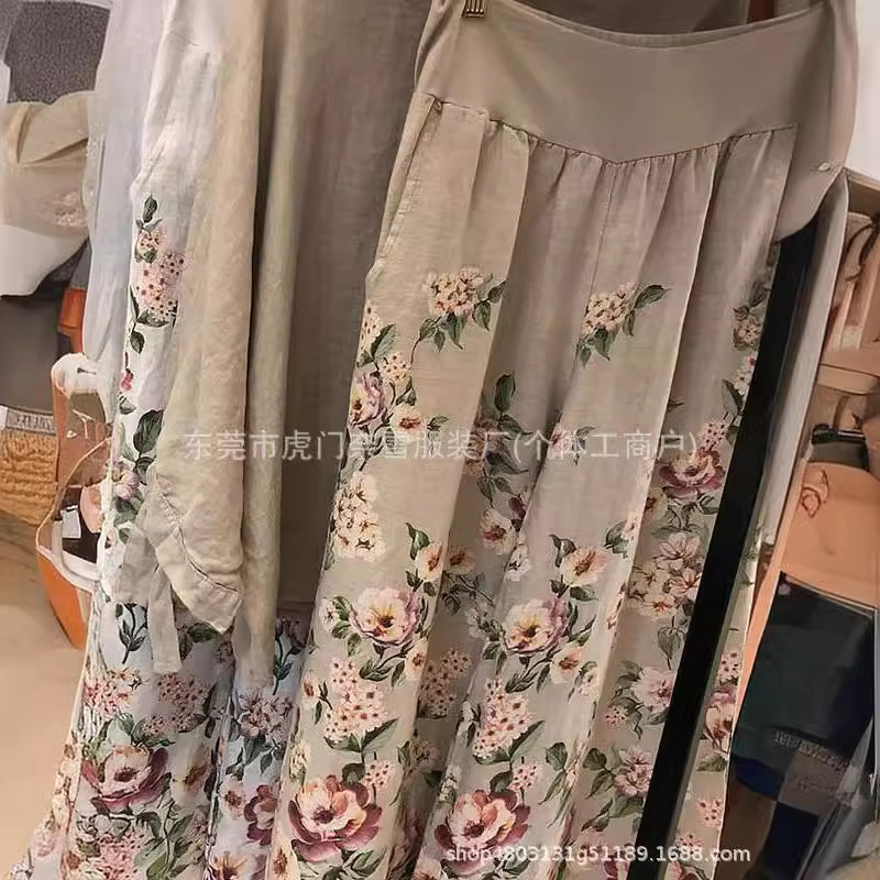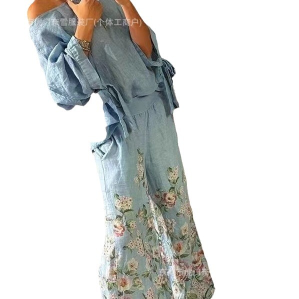 Главная страница > 2024 Летний новый набор хлопка и льна повседневный круглый воротник принт широкий брюки костюм независимая станция Amazon через границу