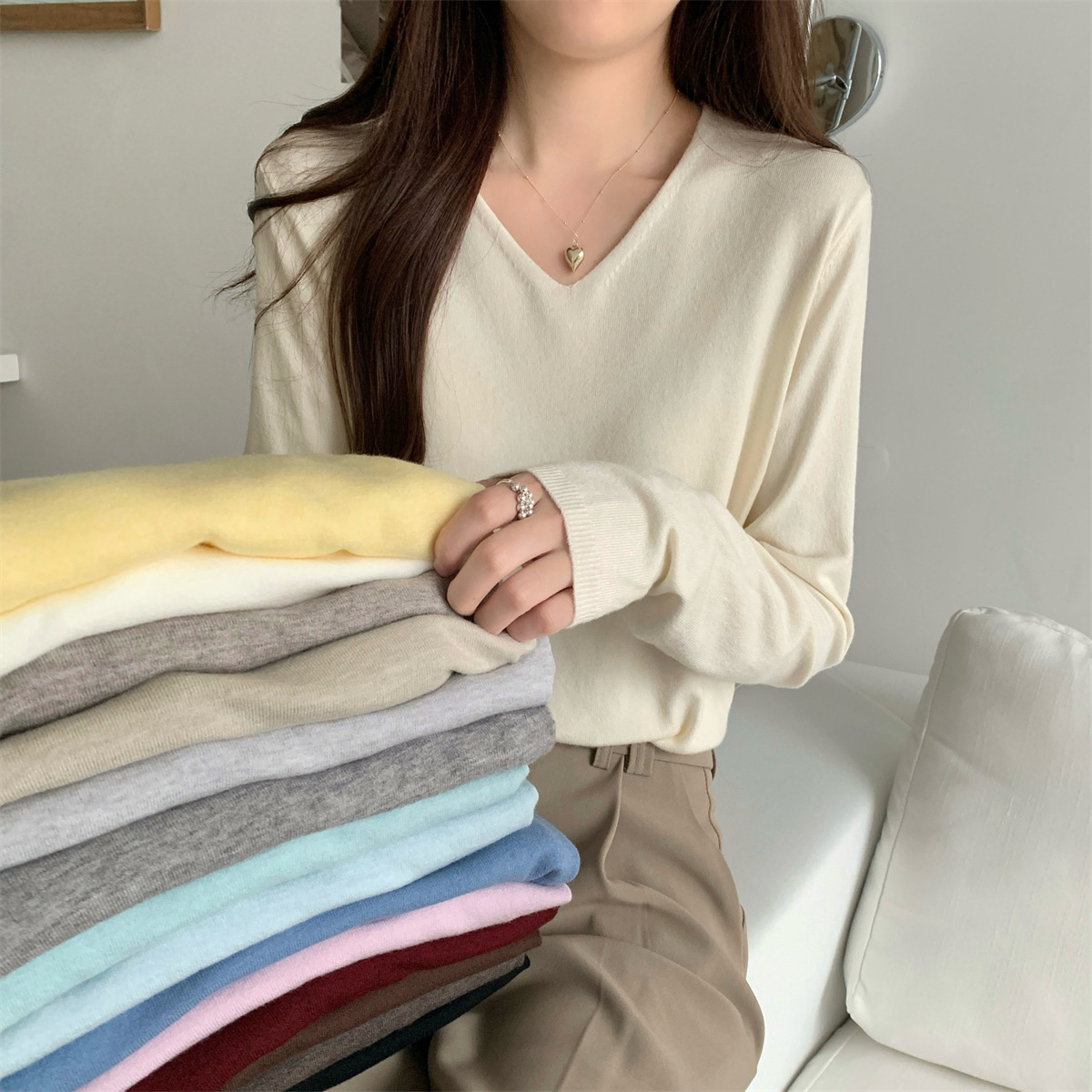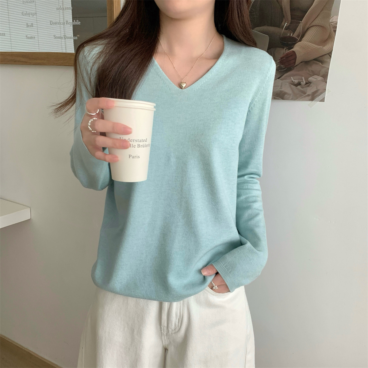 Реальный осенний и зимний корейский vi-vi-vi-vi-vi-vi-свободный ленивый стиль трикотаж женский дикий цвет с длинными рукавами рубашка с дном 71266