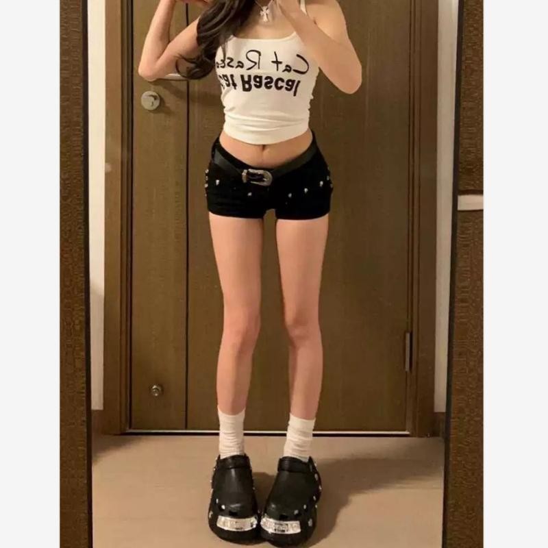 Американские горячие девушки заклепки с низкой талией джинсовые шорты женские 2025 новые черные обтягивка бедра ультра короткие танцевальные шорты